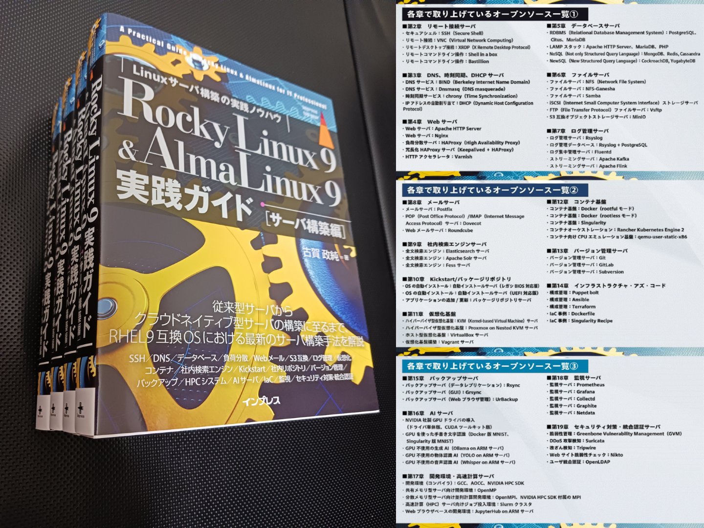 KOGA MASAZUMI 古賀政純 @masazumi_koga · 1d 古賀政純 著 「Rocky Linux 9 & AlmaLinux9実践ガイド[サーバ構築編]」 book.impress.co.jp/books/11231011… #データセンター #サービス #構築 #オープンソース #ビッグデータ #IoT #生成AI #AI #人工知能 #GPU #HPC #並列計算 #Web高速化 #開発 #運用 #自動化 #仮想化 #コンテナ #セキュリティ #統合認証 1 1 45