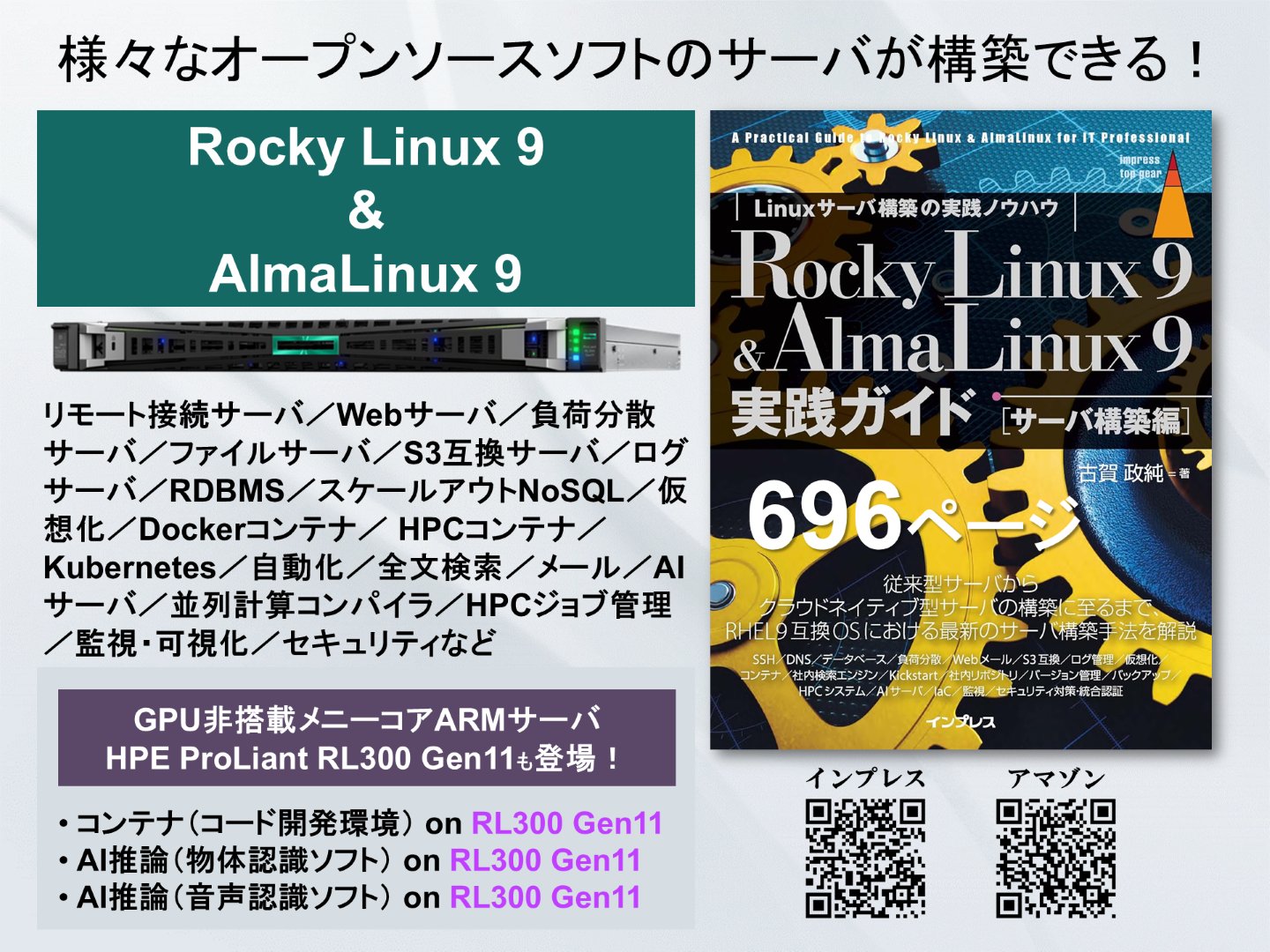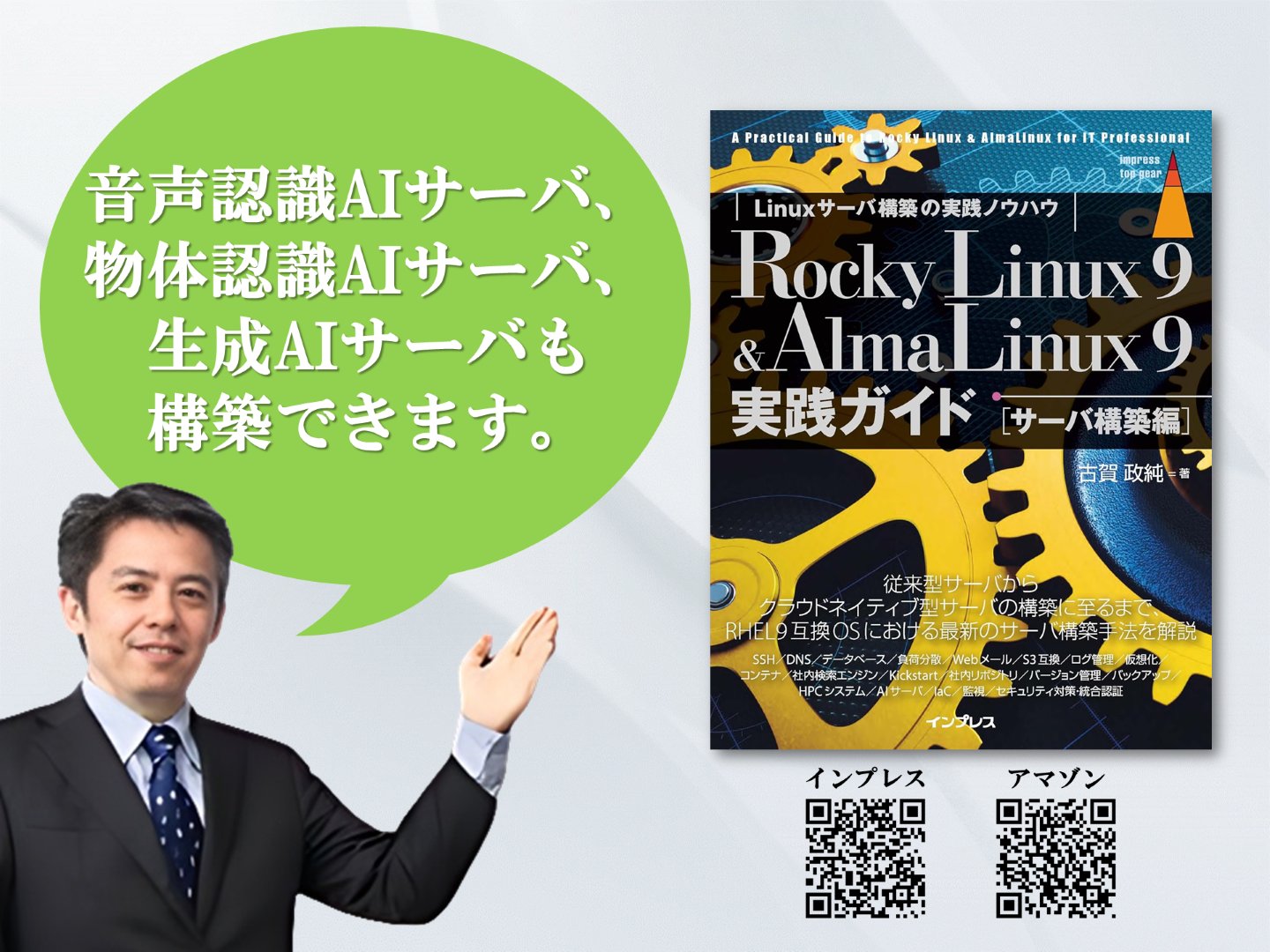 KOGA MASAZUMI 古賀政純 @masazumi_koga · 3d [IT] Rocky Linux 9 & AlmaLinux9実践ガイド[サーバ構築編]古賀 政純 著 book.impress.co.jp/books/11231011… #データセンター #サービス #構築 #オープンソース #ビッグデータ #IoT #生成AI #AI #人工知能 #GPU #HPC #並列計算 #Web高速化 #開発 #運用 #自動化 #仮想化 #コンテナ #セキュリティ #統合認証 1 1 70