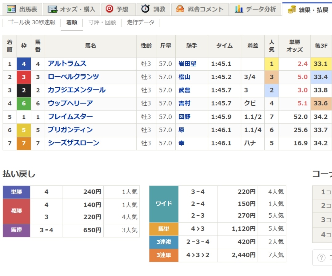 1着④アルトラムス 岩田望来(1番人気)