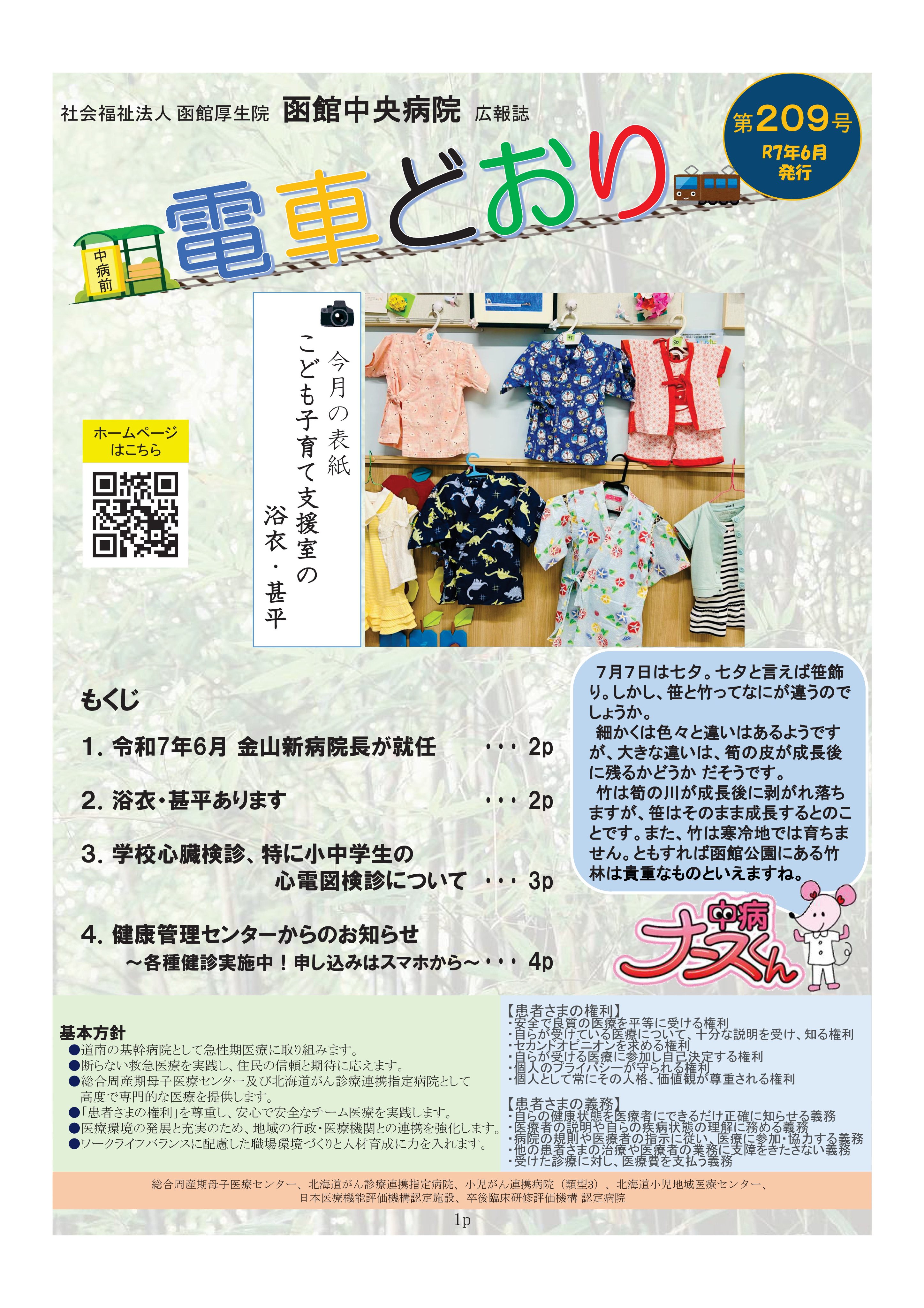 函館中央病院 @hakochu_hp · Jun 26, 2025 当院の広報誌『電車どおり』第209号を発行いたしました☆当院ホームページ内の広報誌をご覧ください。 chubyou.com/kouhoushi/ 令和7年6月より金山病院長が就任いたしました。 広報誌内には就任のご挨拶も掲載しておりますので、ぜひご覧ください! #函館 #函館中央病院 #病院長 #健康診断 #学校検診 2 2 1.6K
