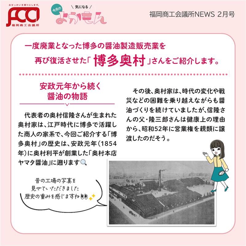 福岡商工会議所 @fukuoka_cci · Apr 7, 2025 #福岡商工会議所NEWS 編集部が街で見つけた気になる「#よかもん 」 🔍✨ #安政元年創業 の味がよみがえった!「#博多奥村」醤油 を取材しました🎙️📸 ます🎵 fukunet.or.jp/about/news/jgOyZ #福岡商工会議所 #福岡土産 #商工会議所 #rxOi6 1 6 181