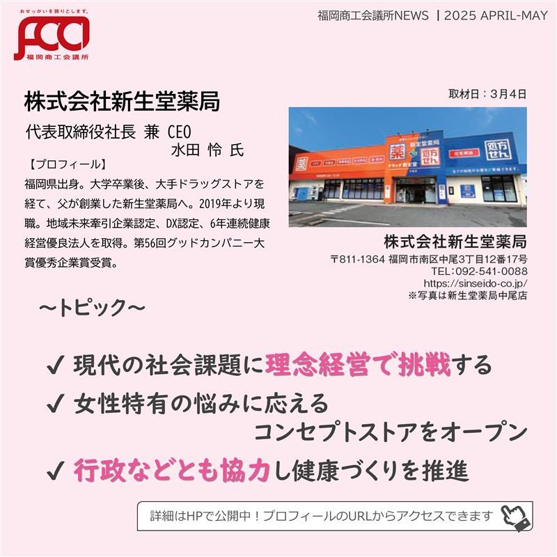 福岡商工会議所 @fukuoka_cci · Apr 23, 2025 #福岡商工会議所news 4月号��#カンパニーズチャレンジ 今月は、福岡市南区中尾に本社を置く「#新生堂薬局」を取材しました📷 fukunet.or.jp/about/news/miNE 3 231