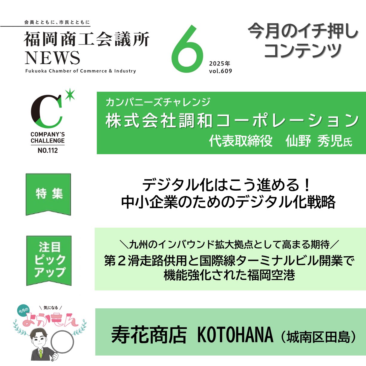 福岡商工会議所 @fukuoka_cci · Jun 10, 2025 #福岡商工会議所NEWS 6月号発行☂️ 🌈特集 中小企業の #デジタル化 戦略 🌈注目ピックアップ 第2滑走路供用と国際線ターミナルビル開業で機能強化された #福岡空港 🌈#カンパニーズチャレンジ ㈱調和コーポレーション 🌈 #よかもん 寿花商店 KOTOHANA(城南区) fukunet.or.jp/about/news/bG7EJt 1 7 468