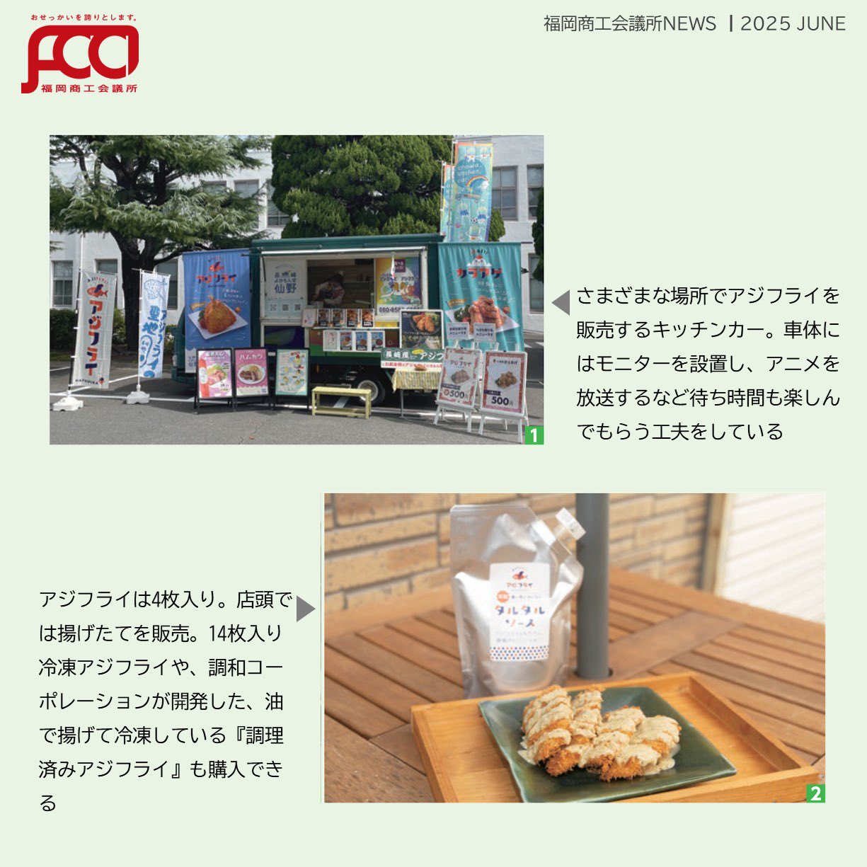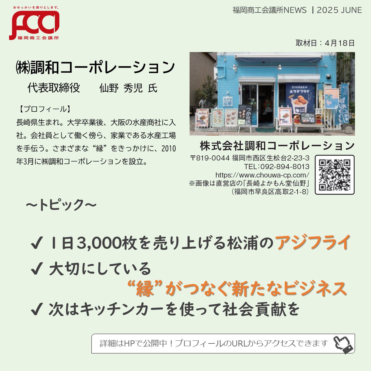 福岡商工会議所 @fukuoka_cci · Jun 18, 2025 #福岡商工会議所news 6月号 #カンパニーズチャレンジ vol.112 #アジフライ から #化粧水 まで〜”縁”がつないだビジネスに注目〜 ㍿調和コーポレーション 代表取締役 仙野 秀児 氏 📍福岡発!アジフライで話題のキッチンカー🚚💨の挑戦がアツい🔥fukunet.or.jp/about/news/jhmox #福岡商GL0q4 2 5 391