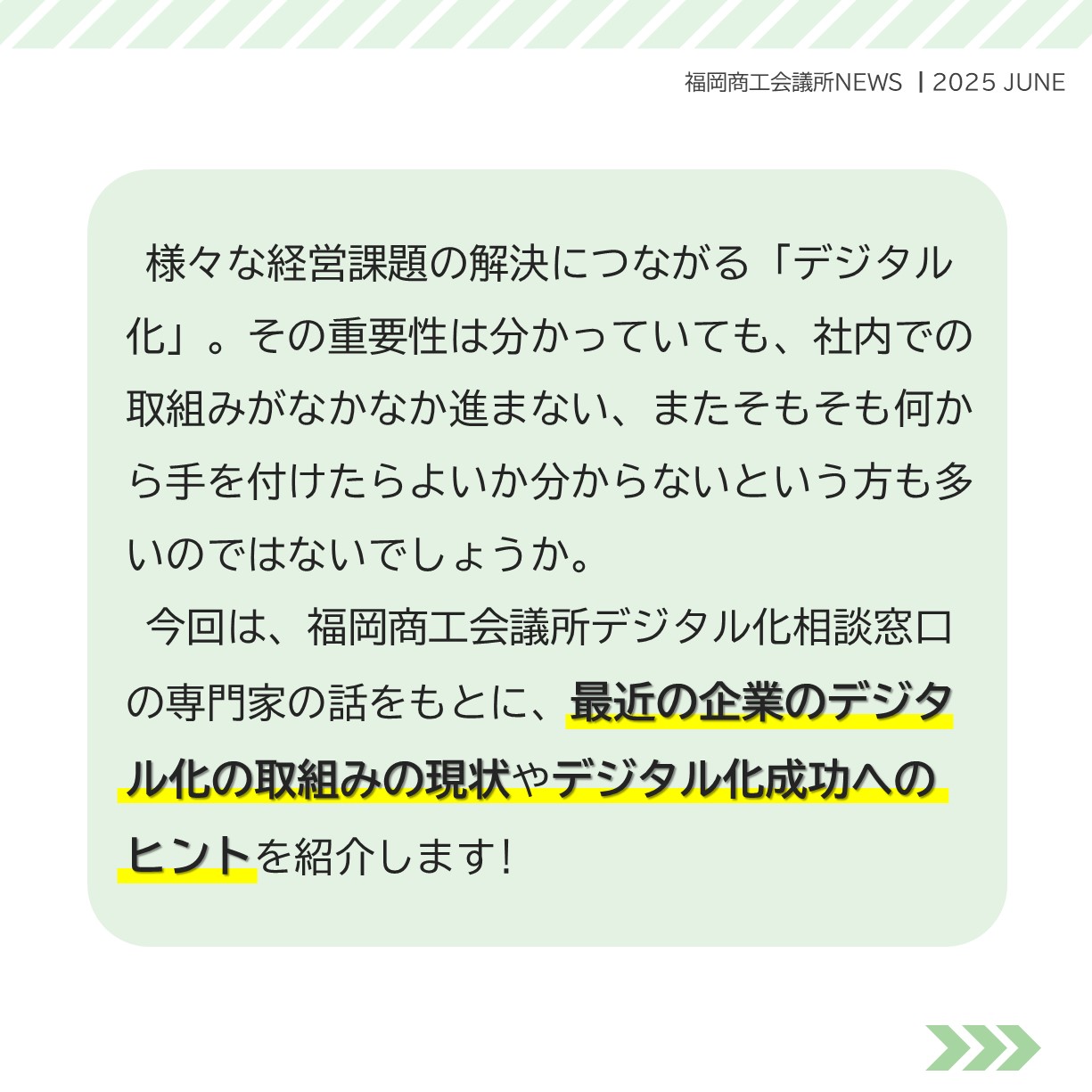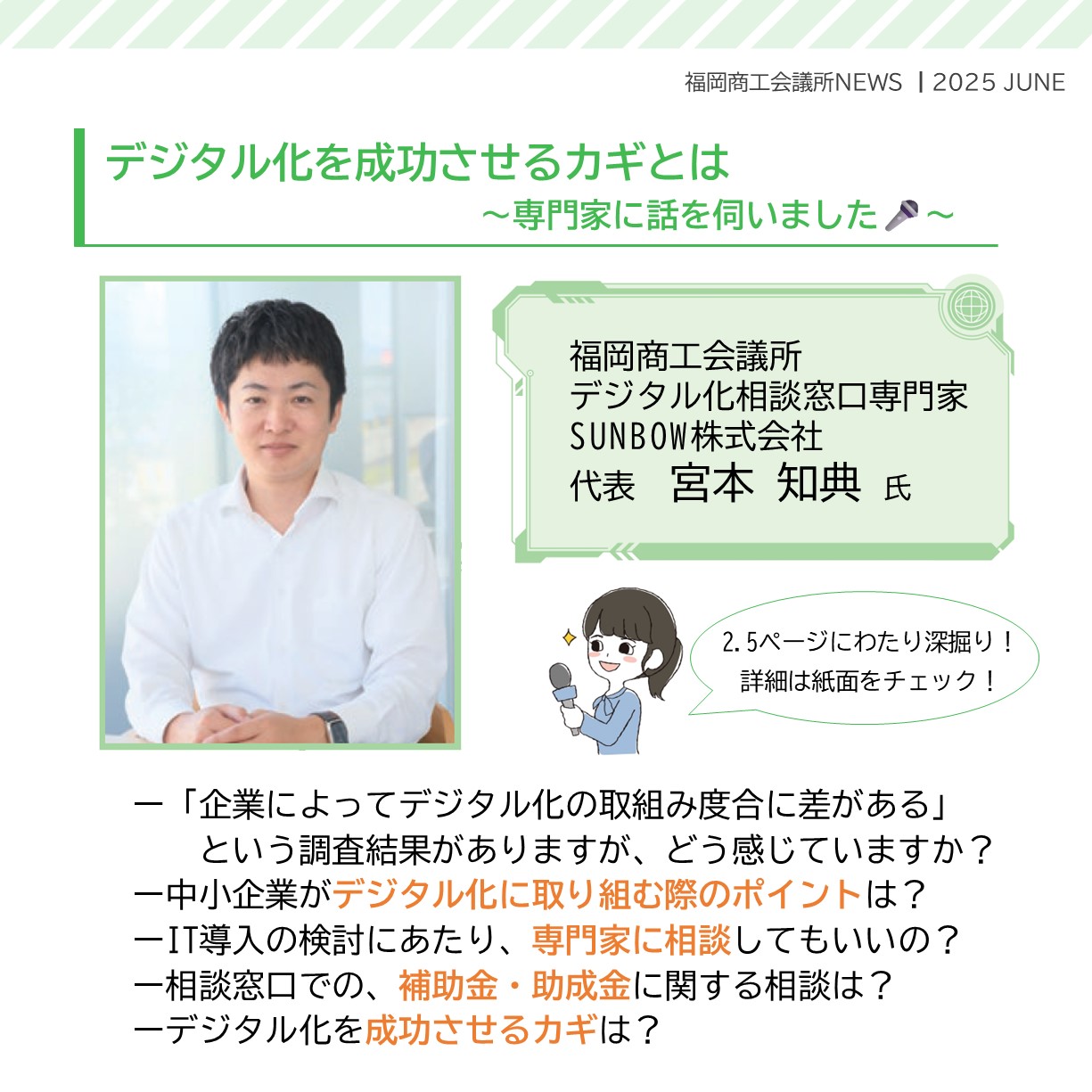 福岡商工会議所 @fukuoka_cci · Jun 24, 2025 #福岡商工会議所NEWS 6月号☔✨ 🔎特集🔎 \#デジタル化 はこう進める!/ #中小企業 のための #デジタル化戦略💡 デジタル化成功の秘訣やポイントを専門家にインタビュー🎤ヒントが満載の6月号特集!ぜひご覧くださいfukunet.or.jp/about/news/jhmox #福岡商工会議所 #商YxrIZ 1 2 101