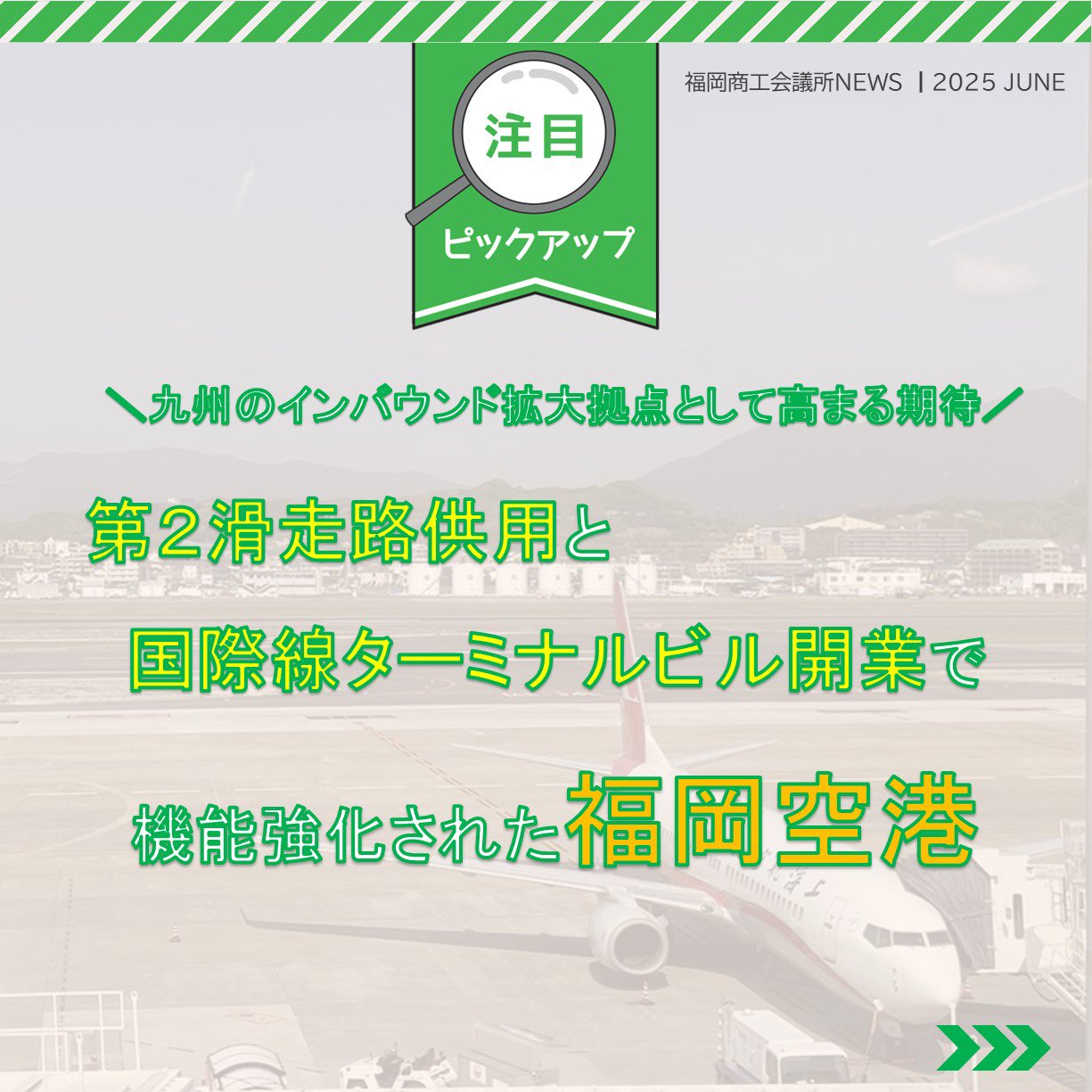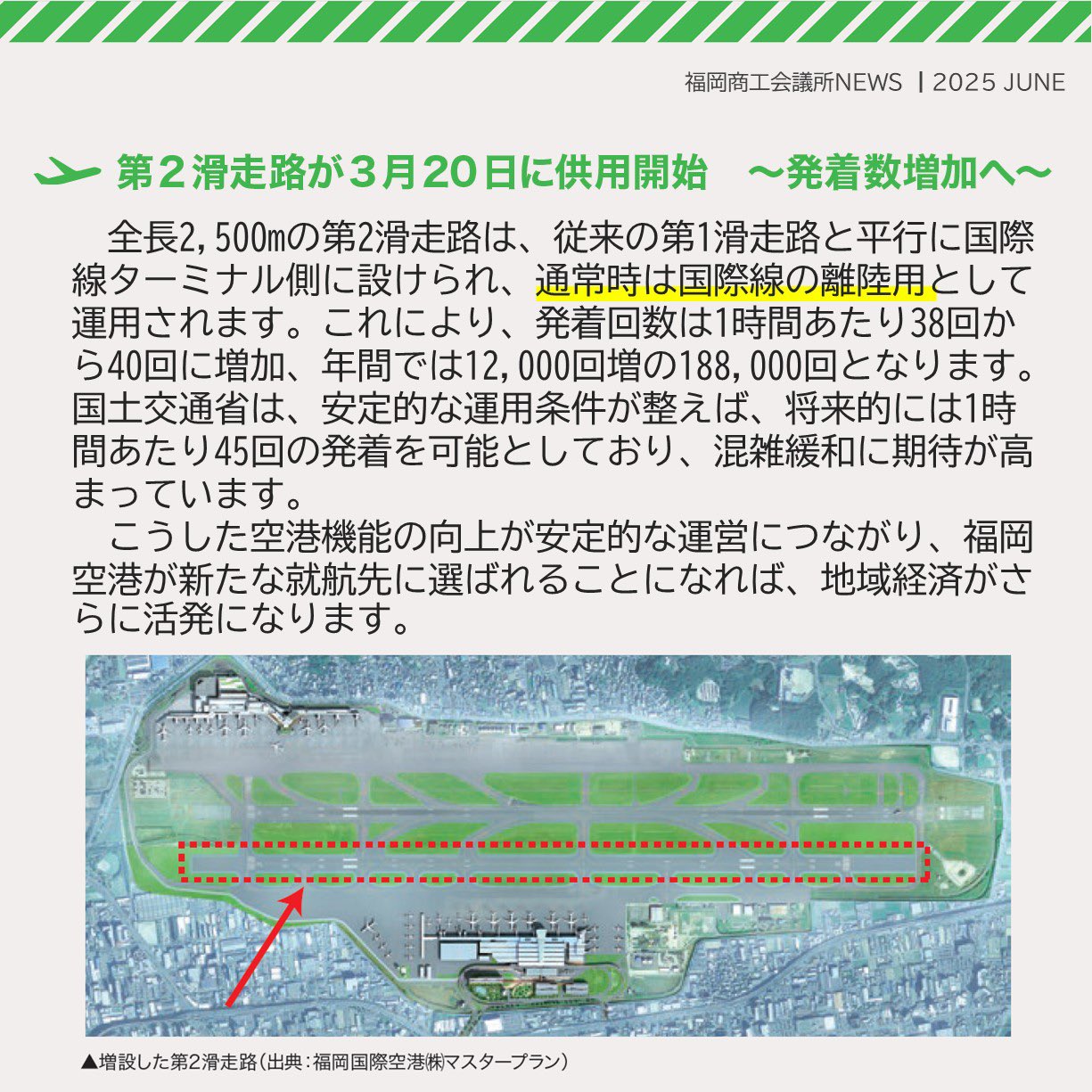 福岡商工会議所 @fukuoka_cci · Jun 24, 2025 #福岡商工会議所NEWS 6月号☔✨ \九州の #インバウンド 拡大拠点として高まる期待/ #福岡空港 が進化中✈️ 第2滑走路の供用開始&国際線ターミナルのリニューアルで、ますます便利&賑やかに! 福岡・九州の未来がここから動き出す! �fukunet.or.jp/about/news/x #福岡商工会議所p 292