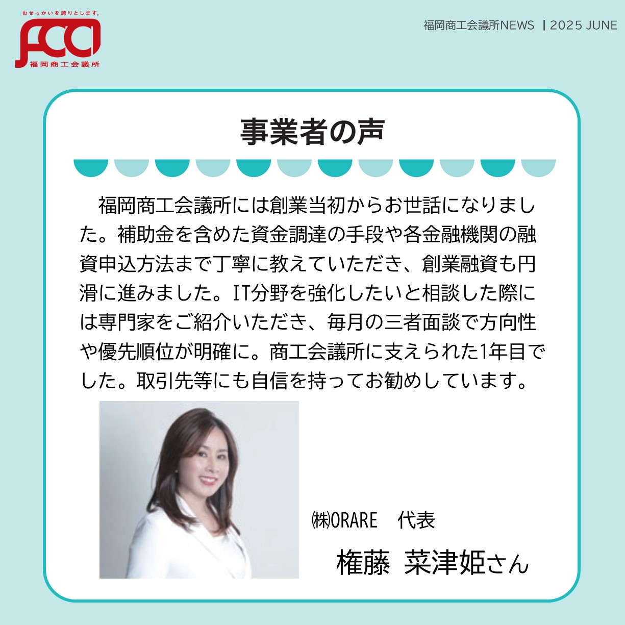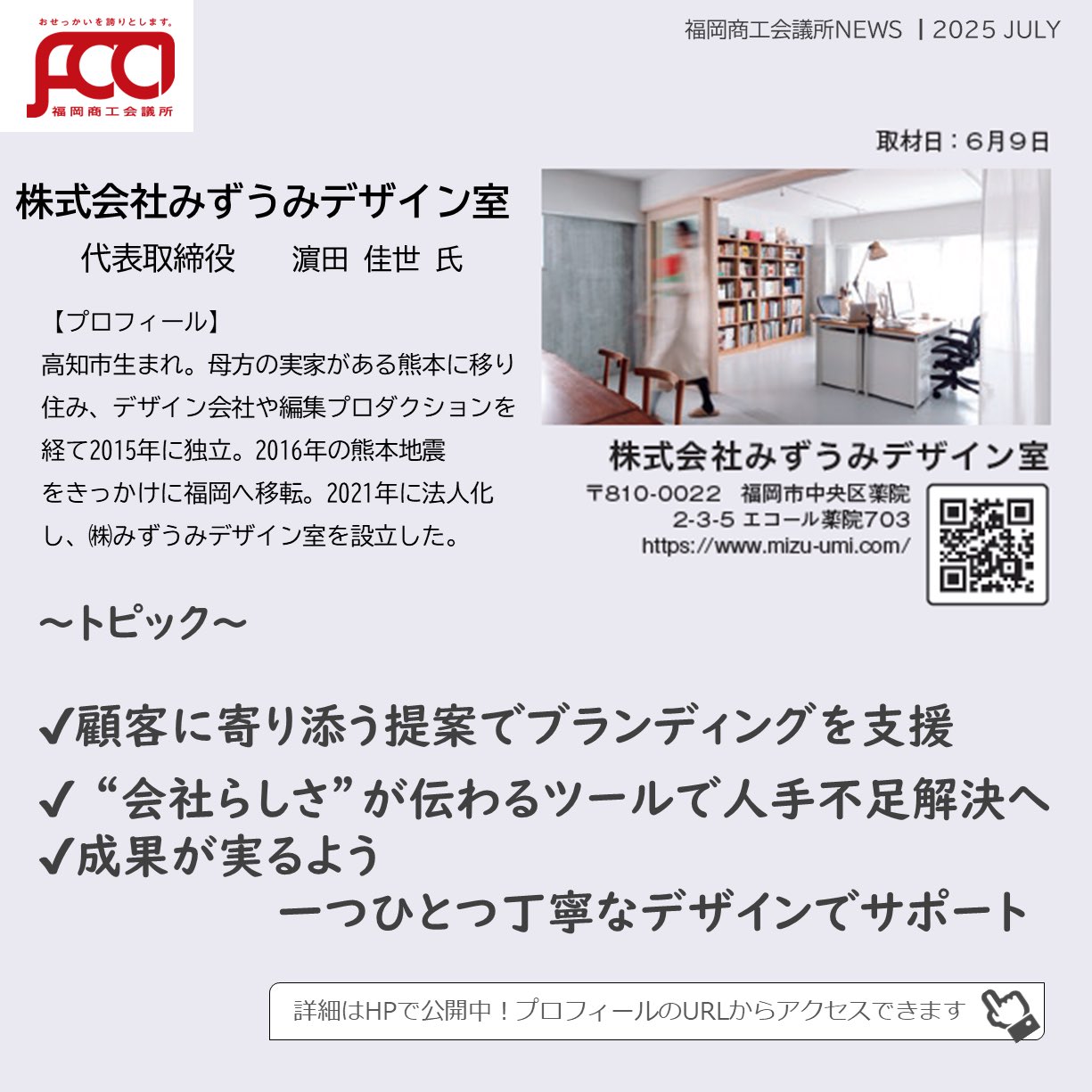 福岡商工会議所 @fukuoka_cci · Jul 23, 2025 #福岡商工会議所news 7月号🌴🌤️ #カンパニーズチャレンジ vol.113 企業に伴走する #デザイン 事務所 商品から #採用 までプロデュース 🎨 ㍿みずうみデザイン室 代表取締役 濱田 佳世 氏 fukunet.or.jp/about/news/hmox #福岡商工4LK1 141