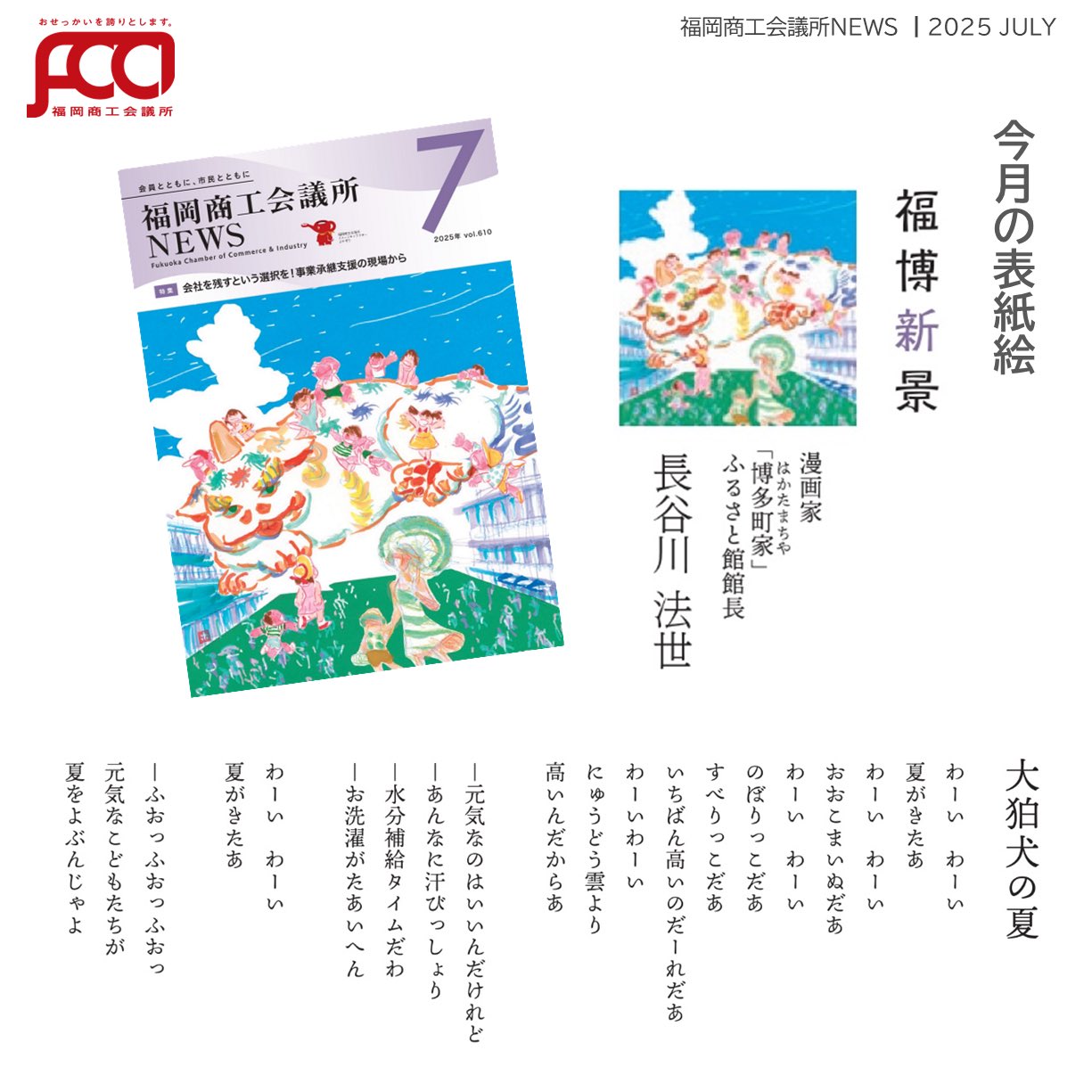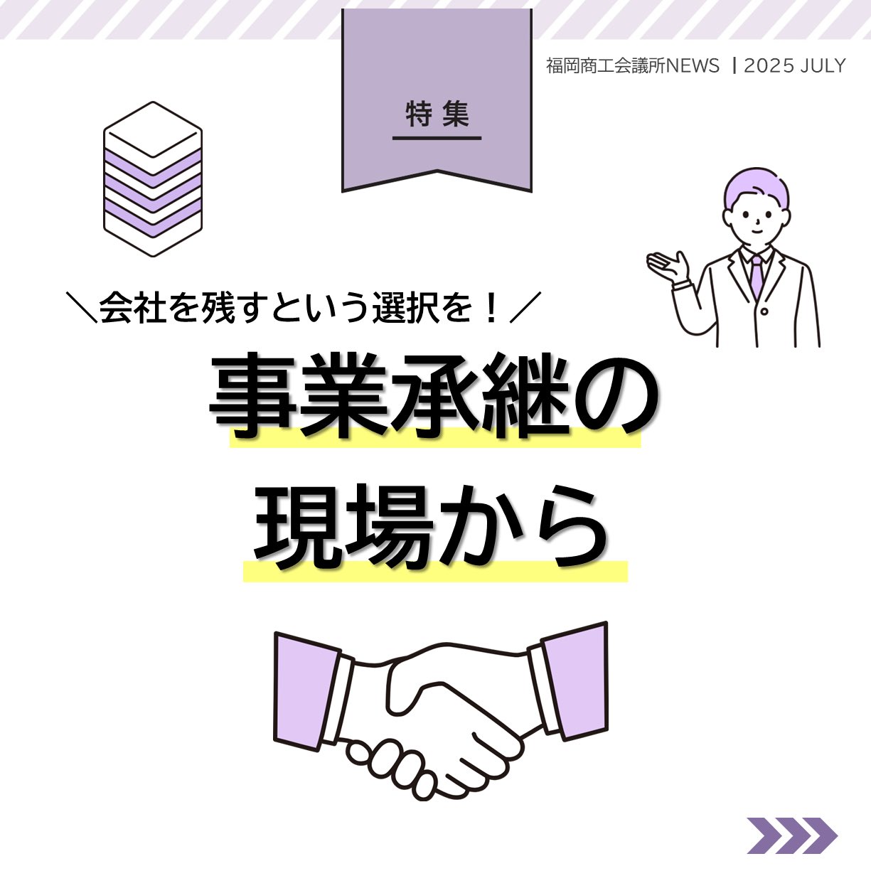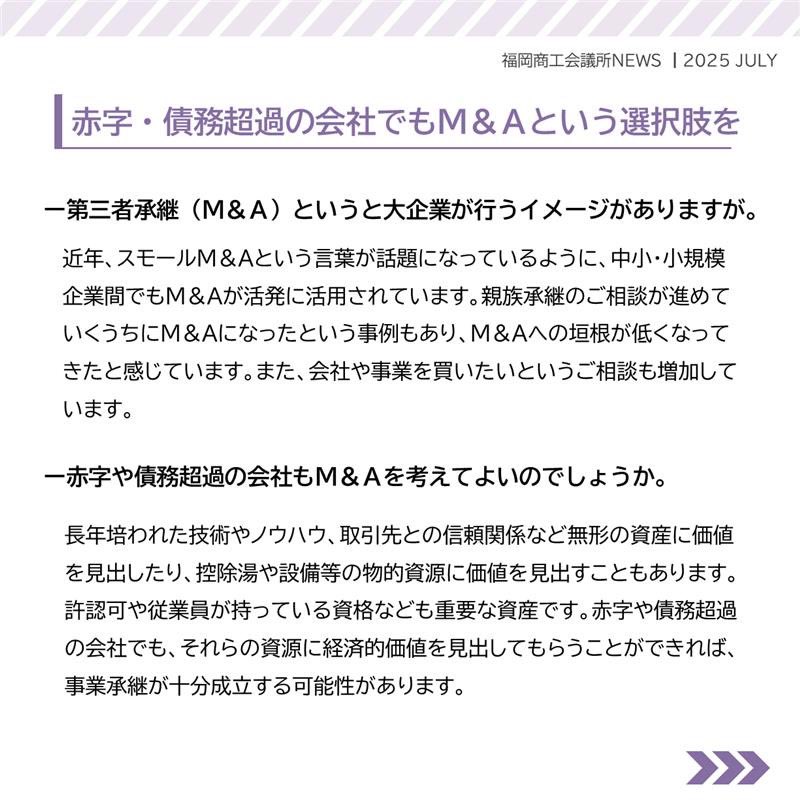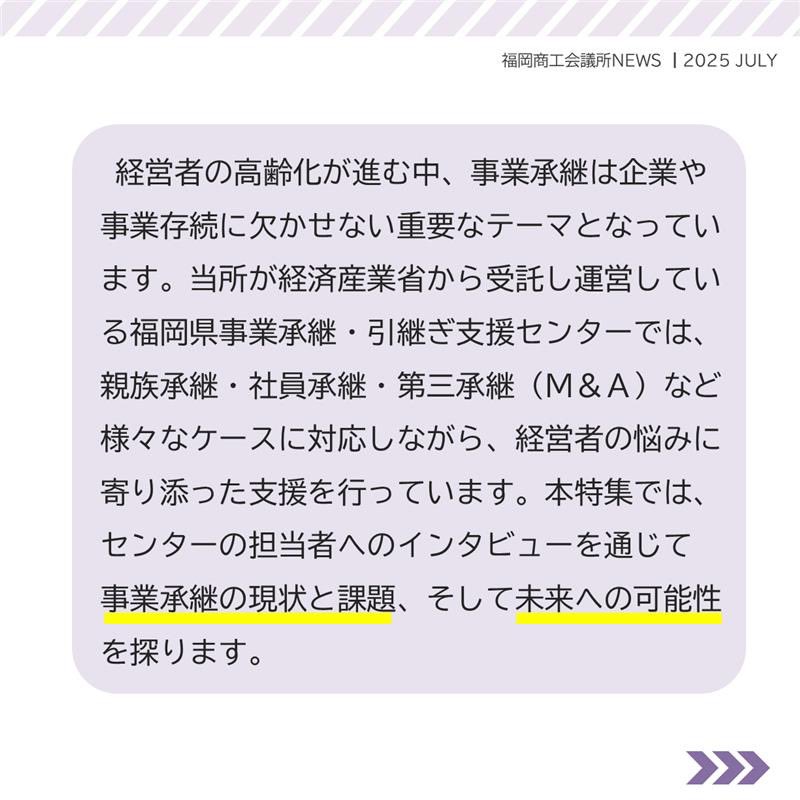 福岡商工会議所 @fukuoka_cci · Jul 25, 2025 #福岡商工会議所NEWS 7月号🌴🌤️ 🔎#特集🔎 \会社を残すという選択を!/ 事業承継支援の現場から🤝🏢 #事業承継 について、専門家にインタビュー🎤 事業承継の情報が盛り沢山!会議所ニュース7月号特集!ぜひご覧くfukunet.or.jp/about/news/ThXjgOyZ #qCAhFJij 91
