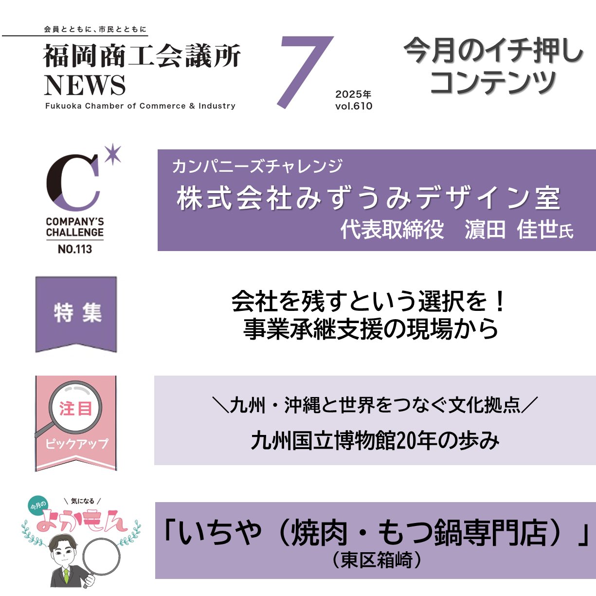 福岡商工会議所 @fukuoka_cci · Jul 10, 2025 #福岡商工会議所NEWS 7月号発行🏝️ 🏝️特集 会社を残すという選択を!#事業承継 の現場から 🏝️注目ピックアップ \九州・沖縄と世界をつなぐ文化交流拠点/ #九州国立博物館 20年の歩み 🏝️#カンパニーズチャレンジ ㈱みずうみデザイン室 🏝️#よかもん いちや(東区箱fukunet.or.jp/about/news/QhQ1h3l 1 156