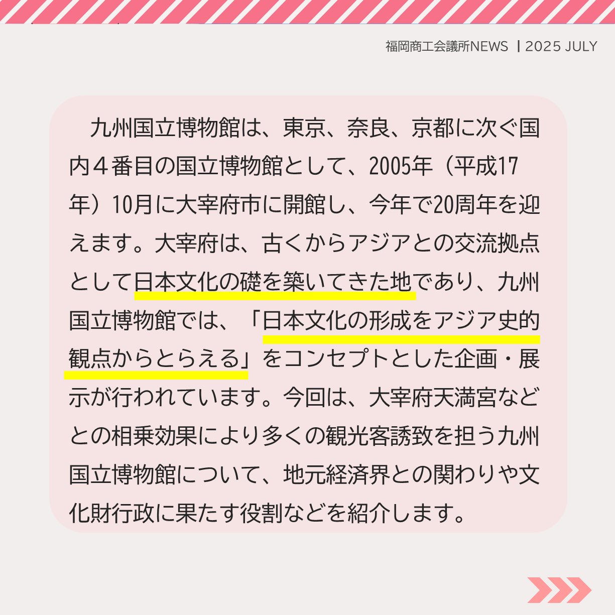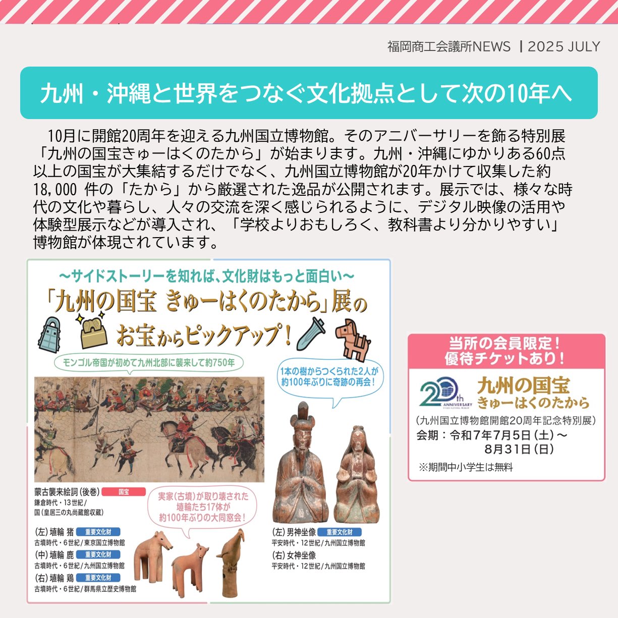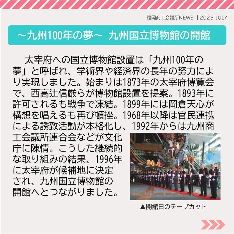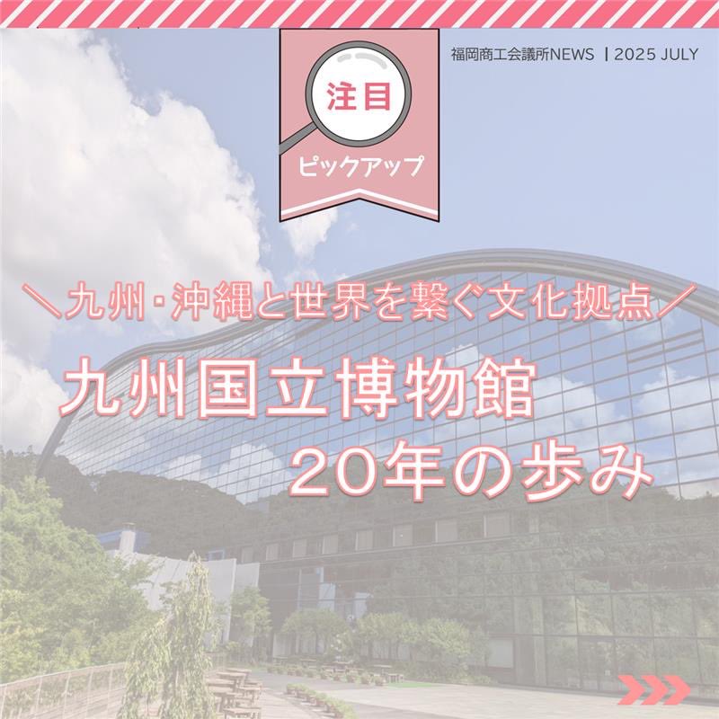 福岡商工会議所 @fukuoka_cci · Jul 28, 2025 #福岡商工会議所NEWS 7月号🌴☀️ 🔍#注目ピックアップ🔎 \九州・沖縄と世界をつなぐ文化拠点/ #九州国立博物館 20周年の歩み🏃➡️ 多くの観光客誘致を担う九州国立博物館について、地元経済界との関わりや文化財行政に果たす役割などを紹介fukunet.or.jp/about/news/jhmox #福岡4oVST 6 240