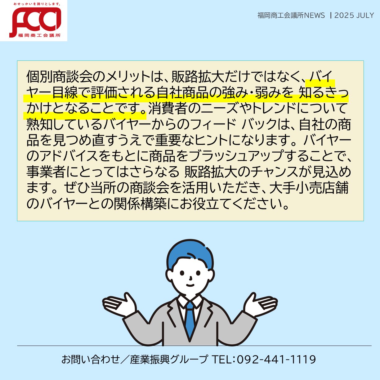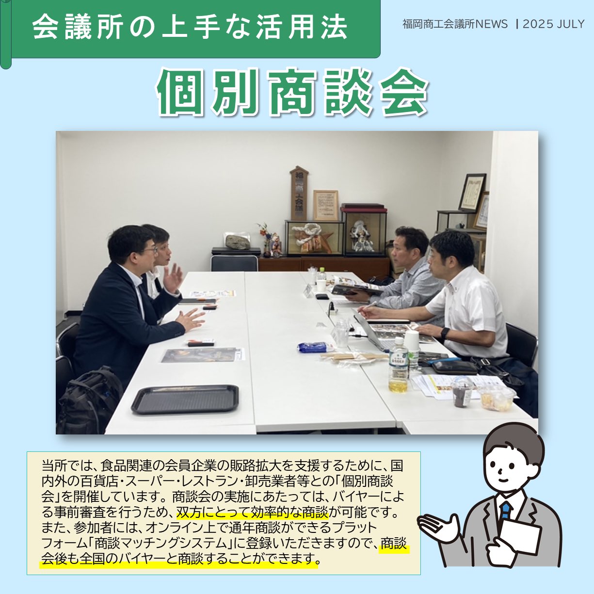 福岡商工会議所 @fukuoka_cci · Jul 29, 2025 #福岡商工会議所NEWS 7月号🌴🌤 福岡商工会議所の上手な活用法をご紹介☝️ 「#個別商談会 」 当所では、食品関連の会員企業の #販路拡大 を支援するために、国内外の百貨店・卸売業者等との「個別商談会」を開催しています。 詳細は誌面をチェック!fukunet.or.jp/about/news/OyZ #福岡商工会onn 131
