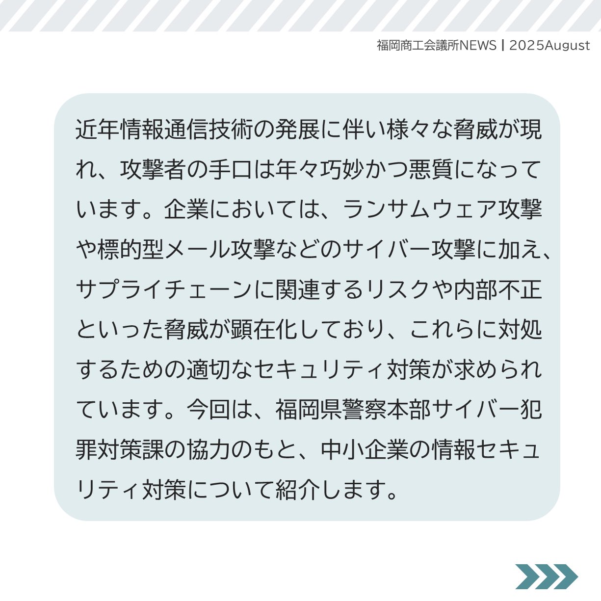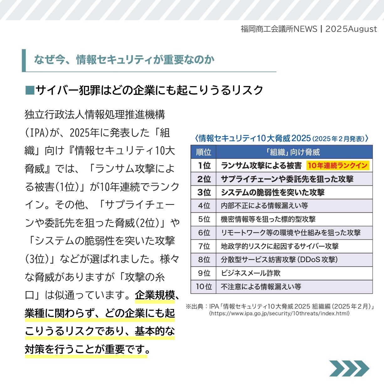 福岡商工会議所 @fukuoka_cci · Aug 22, 2025 #福岡商工会議所NEWS 8月号🏖️🍧 🔎#特集🔎 サイバー犯罪 から会社と顧客を守るために 〜あなたの会社の セキュリティ対策は大丈夫ですか?〜👮 サイバー攻撃を受けた際の被害例や会社を守るための情報セキュリティ対策についてご紹fukunet.or.jp/about/news/QbLAw4 #福岡lcH27f 4 254