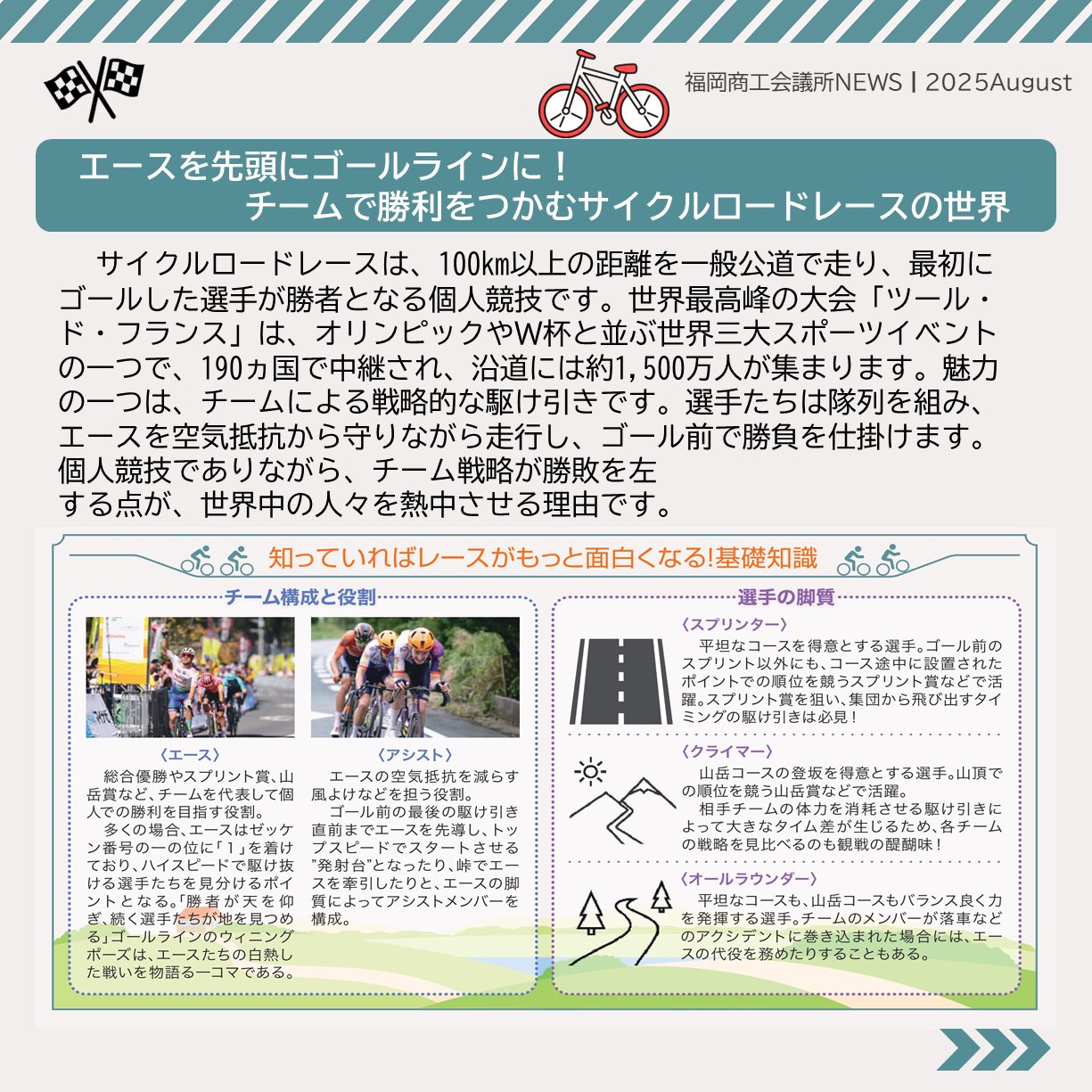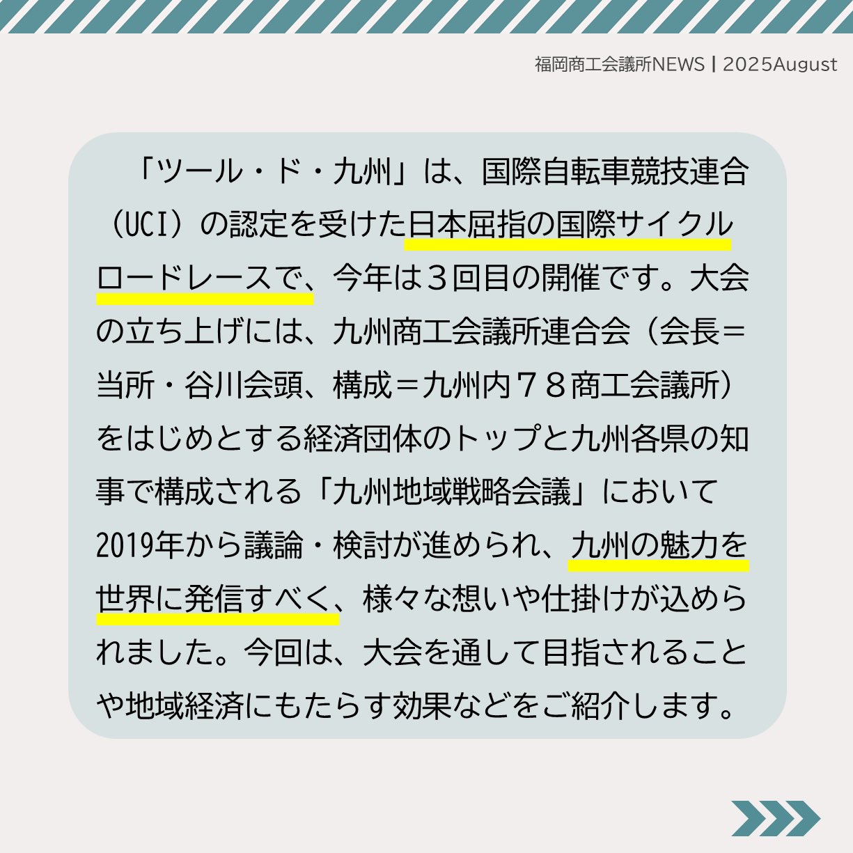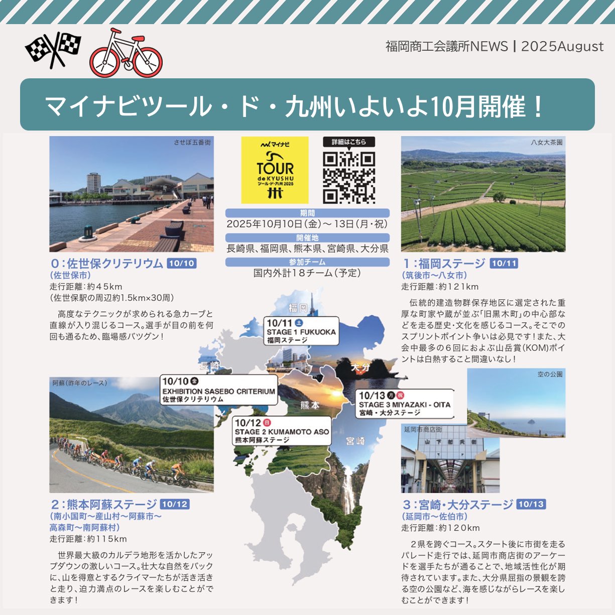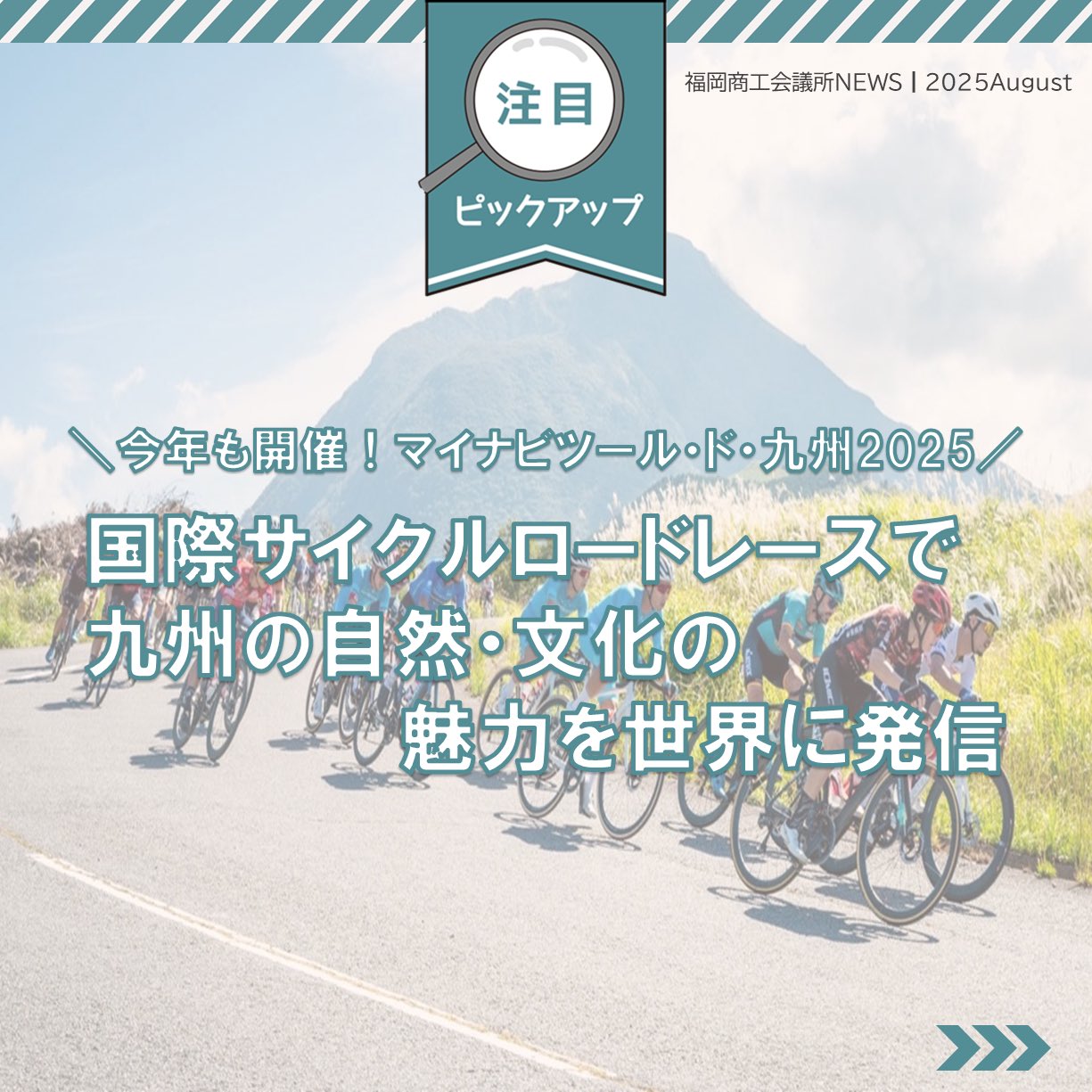 福岡商工会議所 @fukuoka_cci · Aug 25, 2025 #福岡商工会議所NEWS 8月号🏖️🍧 🔍#注目ピックアップ🔎 \今年も開催!マイナビ ツール・ド・九州2025/ 国際サイクルロードレースで 九州の自然・文化の魅力を世界に発信🚴♂️ 詳しくは紙面でチェfukunet.or.jp/about/news/hXjhmox #福EgBVdIa 1 7 236