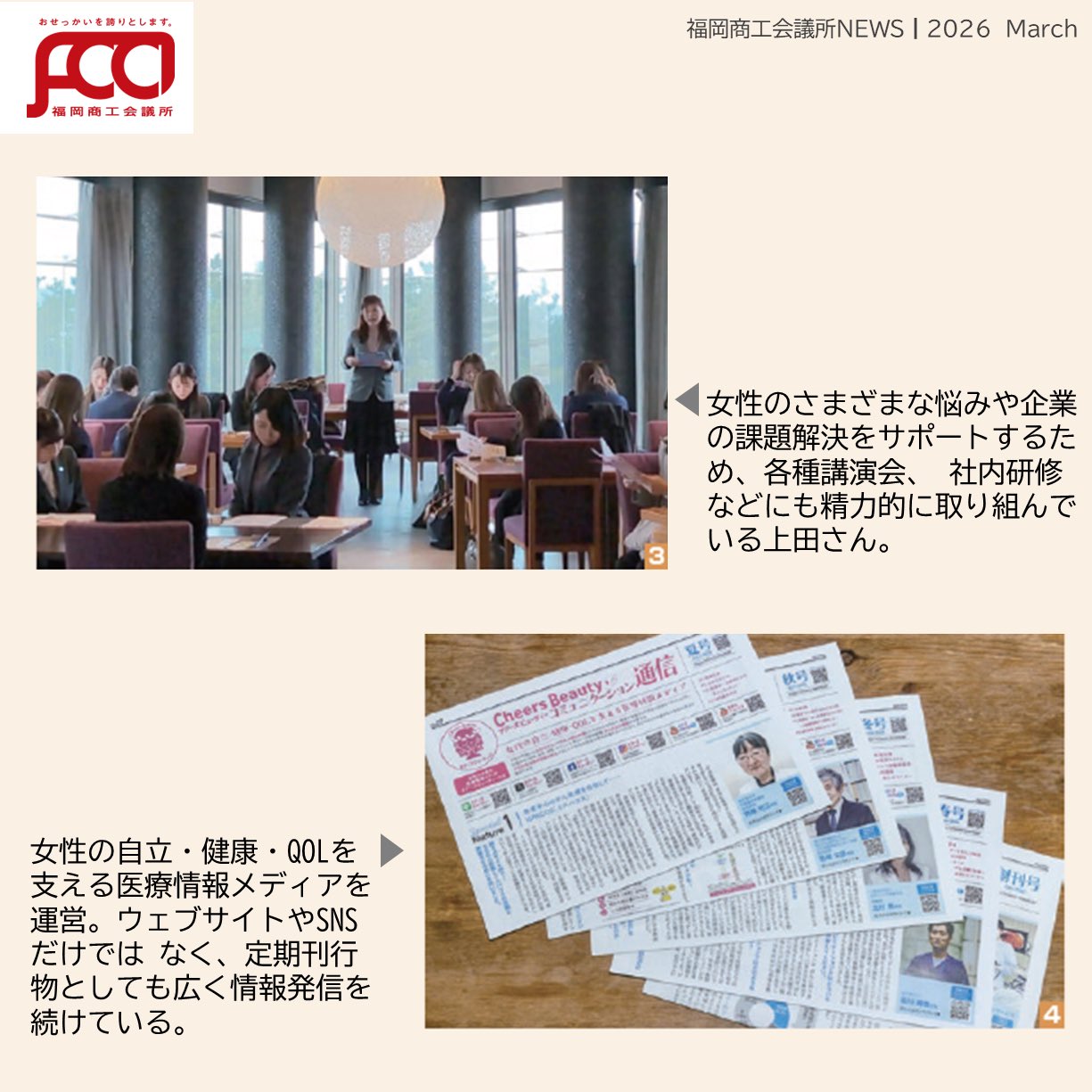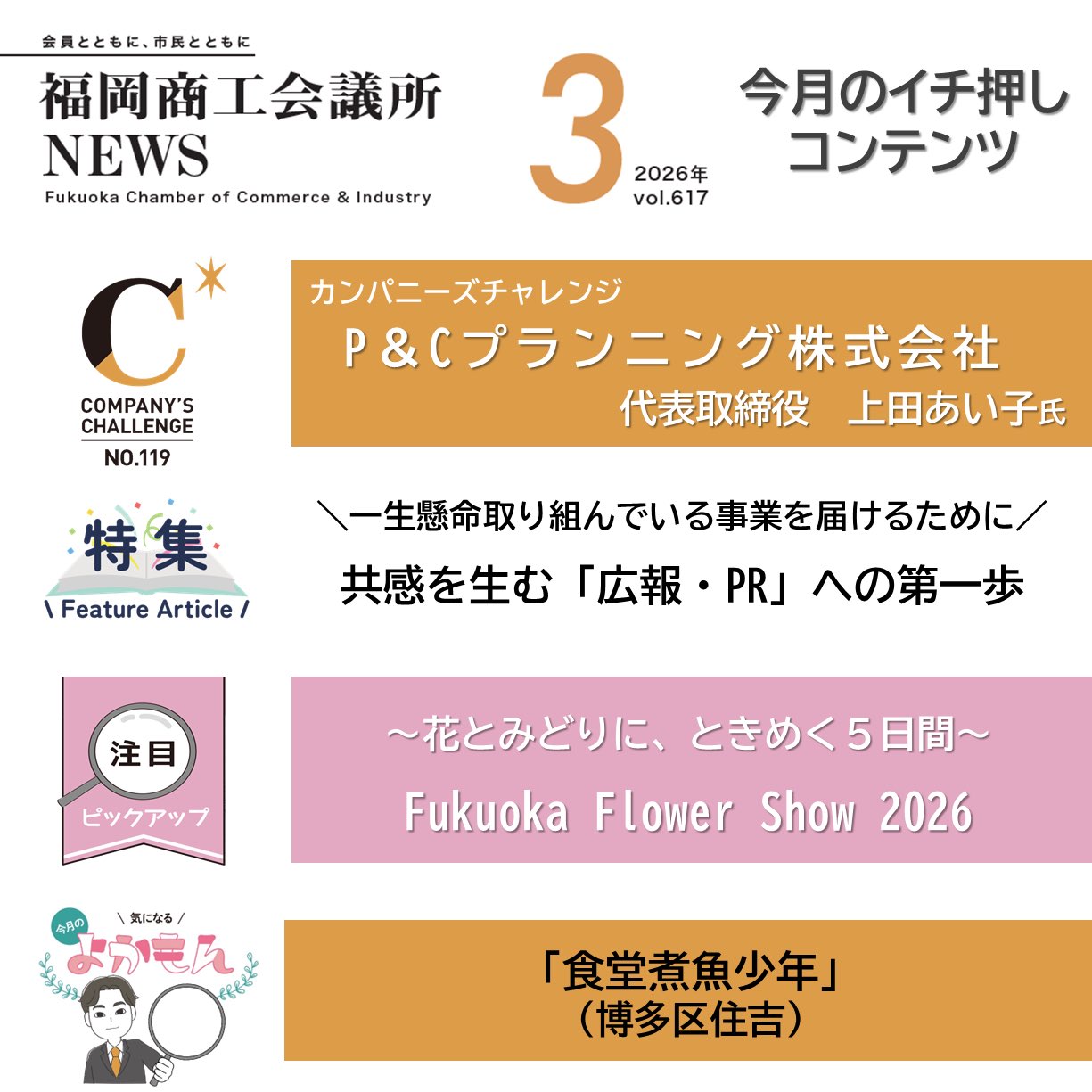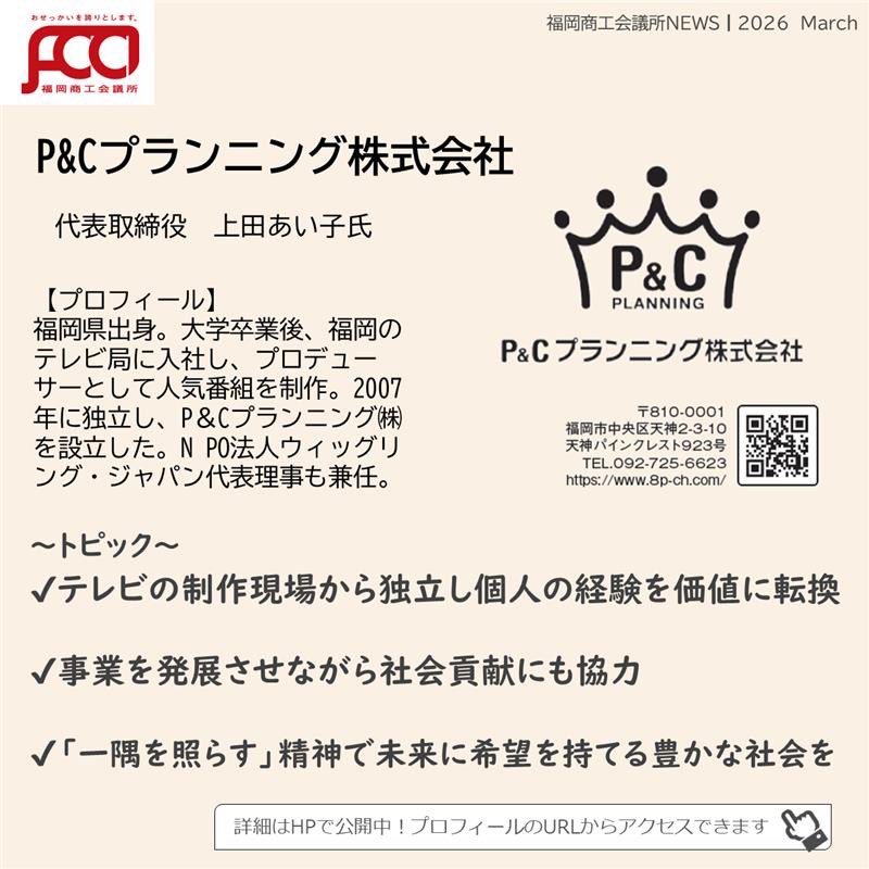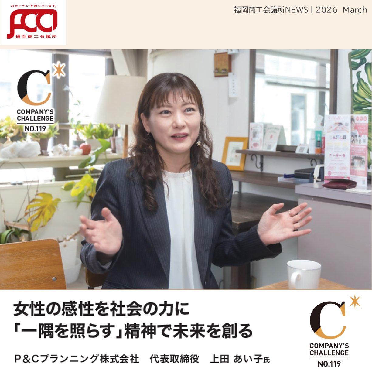 福岡商工会議所 @fukuoka_cci · 1d #福岡商工会議所NEWS 会報誌3月号🎎🌷 カンパニーズチャレンジ Vol.119 女性の感性を社会の力に 「一隅を照らす」精神で未来を創る 🎤P&Cプランニング株式会社 代表取締役 上田 あい子 氏 詳細は、福岡商工会議所NEWS3月号fukunet.or.jp/about/news/mox #福岡商工会993 3 85