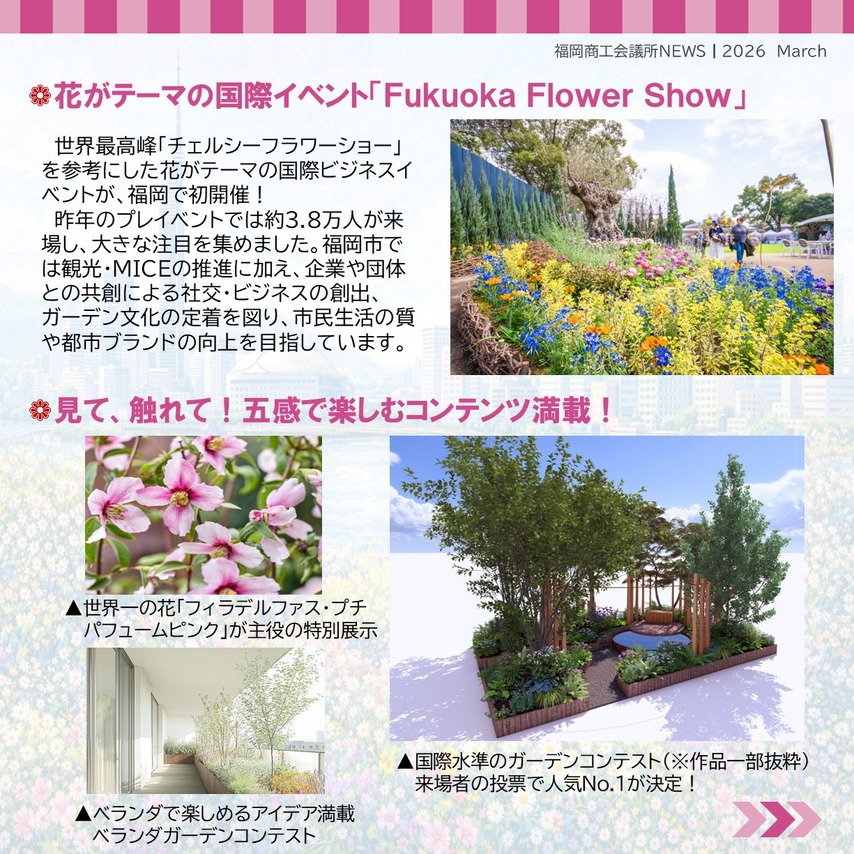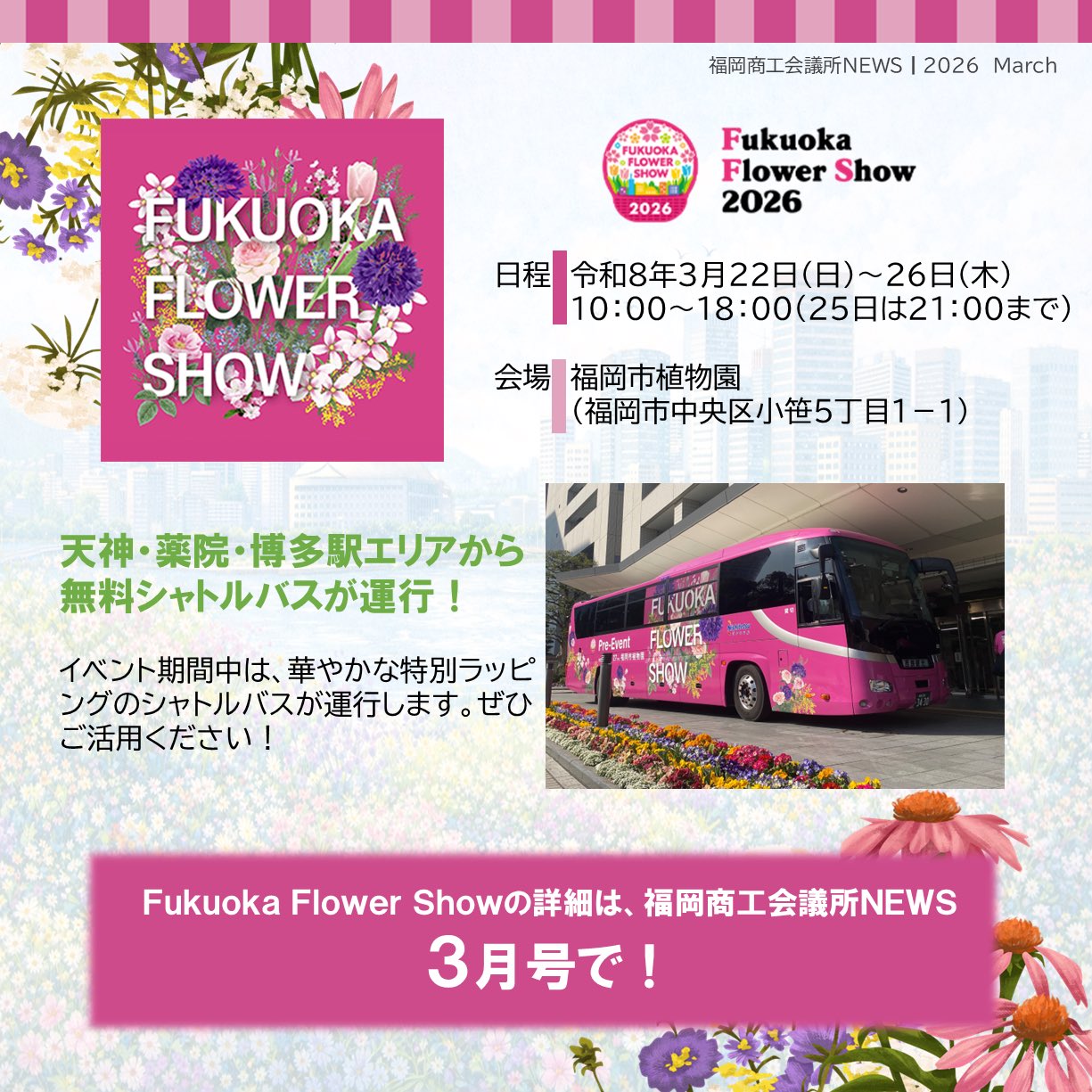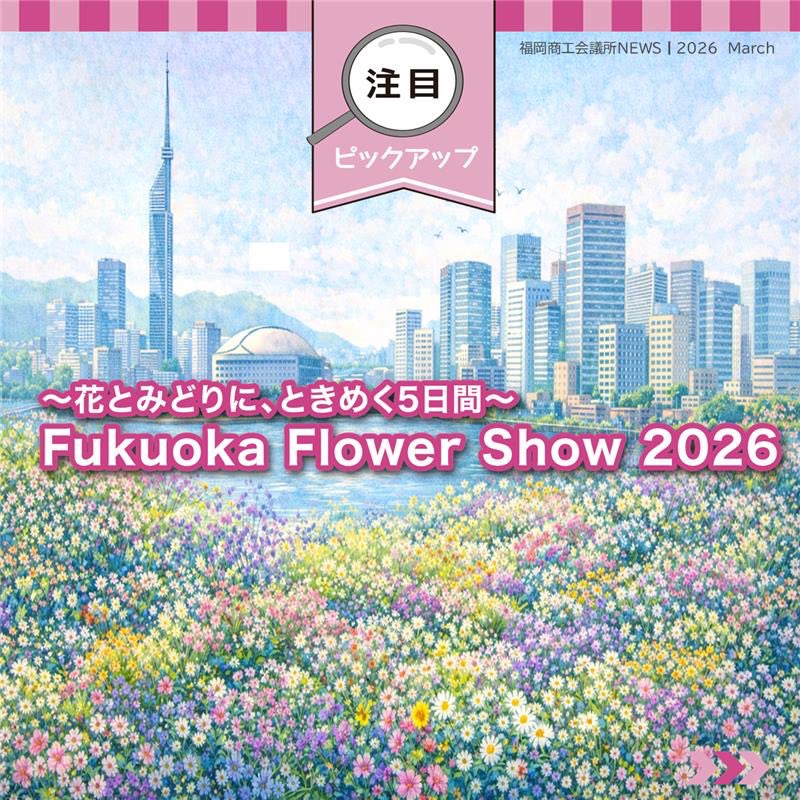 福岡商工会議所 @fukuoka_cci · 5d #福岡商工会議所NEWS 会報誌3月号🎎🌷 💐#注目ピックアップ 💐 ~花とみどりに、~ときめく5日間~ Fukuoka Flower Show 2026 Fukuoka Flower Show 2026の見どころは、 福岡商工会議所NEWS 3月号📖でご紹介!✨ fukunet.or.jp/about/news/Xjhmox #福岡fVsaOK 3 230