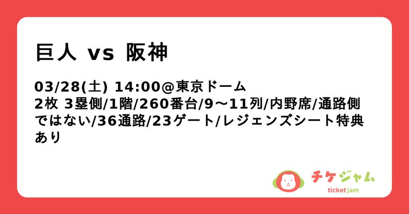 From ticketjam.jp03/28(土) 14:00 東京ドーム 巨人 vs 阪神 16,000円/枚のチケット 2枚お譲りします。|チケジャム