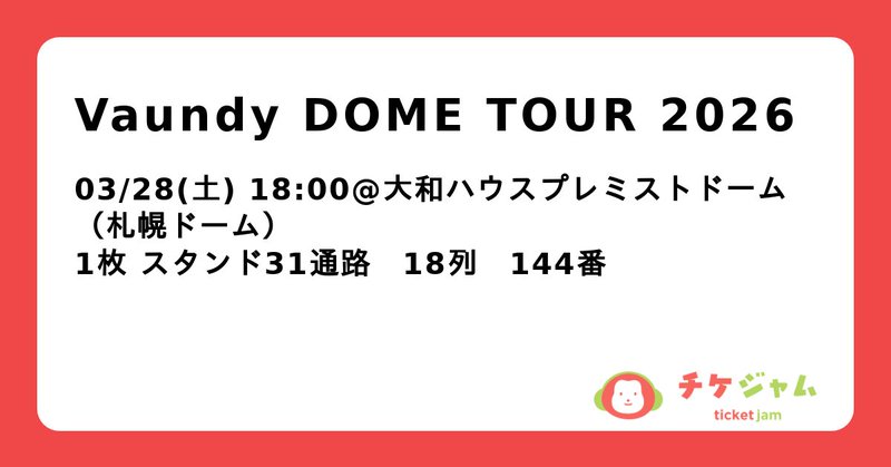 03/28(土) 18:00 大和ハウスプレミストドーム(札幌ドーム) Vaundy DOME TOUR 2026 4,500円/枚のチケット 1枚お譲りします。|チケジャム