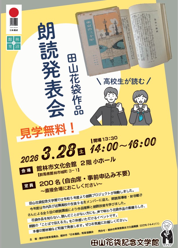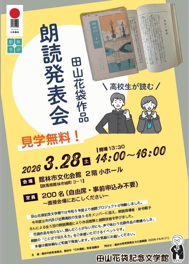 田山花袋記念文学館 @tayamakatai1213 · 8h いよいよ本日開催✨ 昨日のリハーサルでも熱心に練習していました! 開会は午後2時から、フリー入場です! 文化会館(城町3-1)へ、その成果をぜひ味わいにご来場ください🌸 【朗読作品】 「幼きころのスケッチ」「館林の躑躅」「郊外の一部屋」「机」 #田山花袋 #里沼 #館林3 田山花袋記念文学館 @tayamakatai1213 · 1d 【田山花袋朗読発表会 開催間近】 高校生が田山花袋作品を語る朗読発表会は、いよいよ明日開催! 入場は無料、申込も不要です✨ 鶴生田川の桜と一緒に、声で蘇る花袋作品の魅力を味わっていってください🌸 日時:3月28日(土) 午後2時(開場1時半) 会場:館林市文化会館小ホール #館林 #田山花袋d 4 6 432