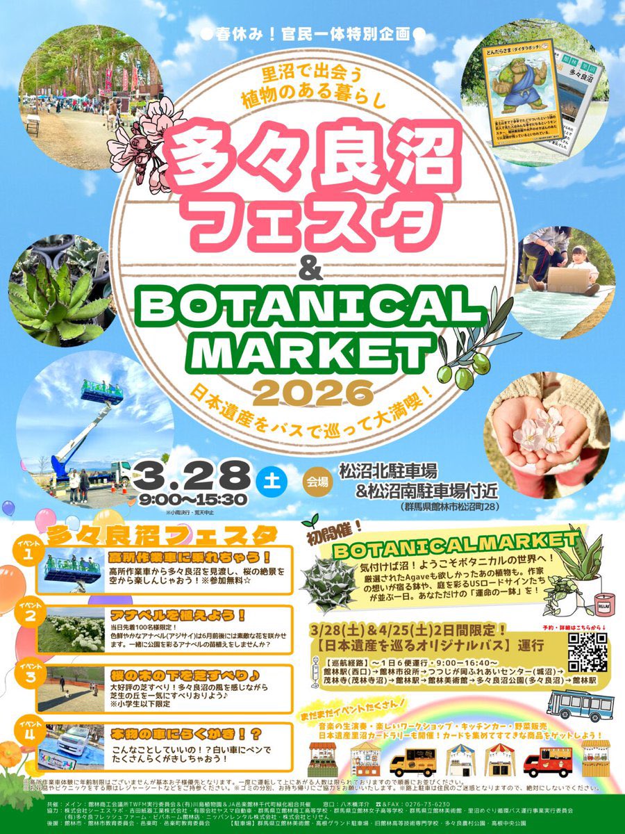 日本遺産!館林市「里沼」公式 @ta_satonuma2019 · 8h 【多々良沼フェスタ&BOTANICAL MARKET】 絶好の行楽日和でこちらも予定通り開催中です! 高所作業車体験は2ヶ所で実施😆落書きや芝滑りにキッチンカーでのランチなどをお楽しみください🤗 HPsato-numa.jp/news/?p=3957OI #日本遺産 #館林 #里沼 #多々良x1 1 1 4 302
