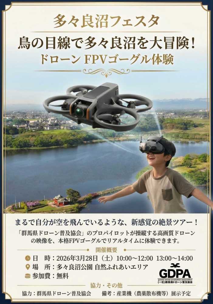 日本遺産!館林市「里沼」公式 @ta_satonuma2019 · 7h Replying to @ta_satonuma2019 自然ふれあいエリアでは群馬県ドローン普及協会さんによる「ドローン FPVゴーグル体験会」も実施中!(10:00-12:00 / 13:00-14:00) 多々良沼上空に飛ばしたドローンカメラからのリアルタイム映像を専用ゴーグルで楽しめます😄まるで鳥になったかのような新体験! #日本遺産 #館林 #里沼 #多々良沼2 1 2 128