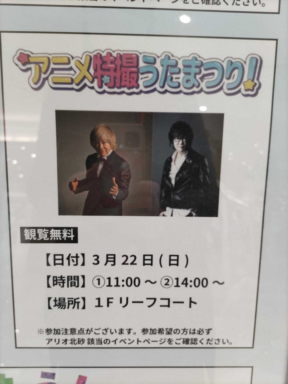 fu~miふみふみ @wWWpldzpeCtLVtG · 6d #アニメ特撮うたまつり! 今日は1日アリオ北砂♪ すんごく楽しいライブでした^^ 歌いまくって気が付いたら汗だく。 #串田アキラ さん #高取ヒデアキ さん #アリオ北砂 218
