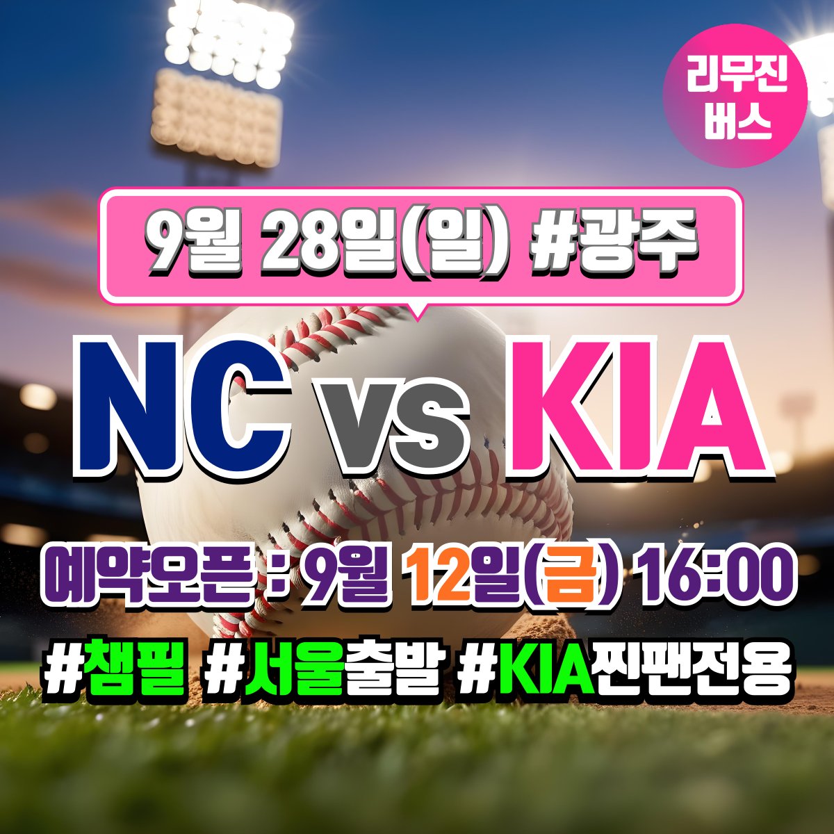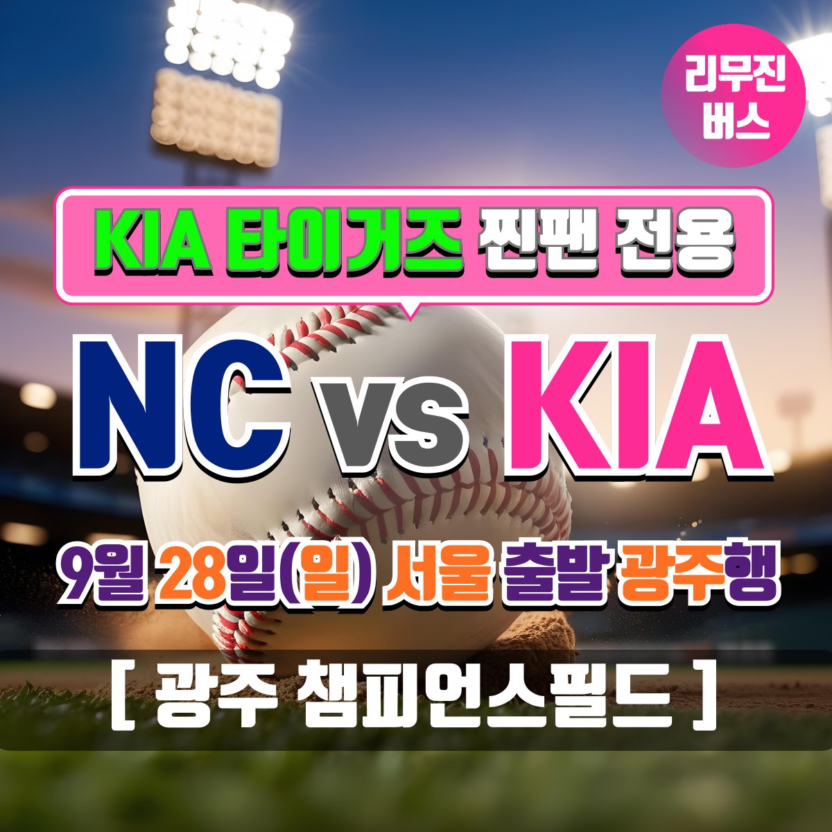 찐팬셔틀 @COS_RANKING · Sep 10, 2025 [KIA 타이거즈 찐팬 전용] 9/28 NC 전 [서울 ↔ 광주 챔피언스필드] 셔틀버스 예약 오픈일 안내 * 예약 오픈일 : 9월 12일(금) 16:00 * 좌석은 예약 선착순으로 지정석입니다. (좌석지정 불가) * 궁금한 점은 언제나 카톡으로 문의주세요. pf.kakao.com/_HPsvn #KIA타이거즈 #챔필 1 125