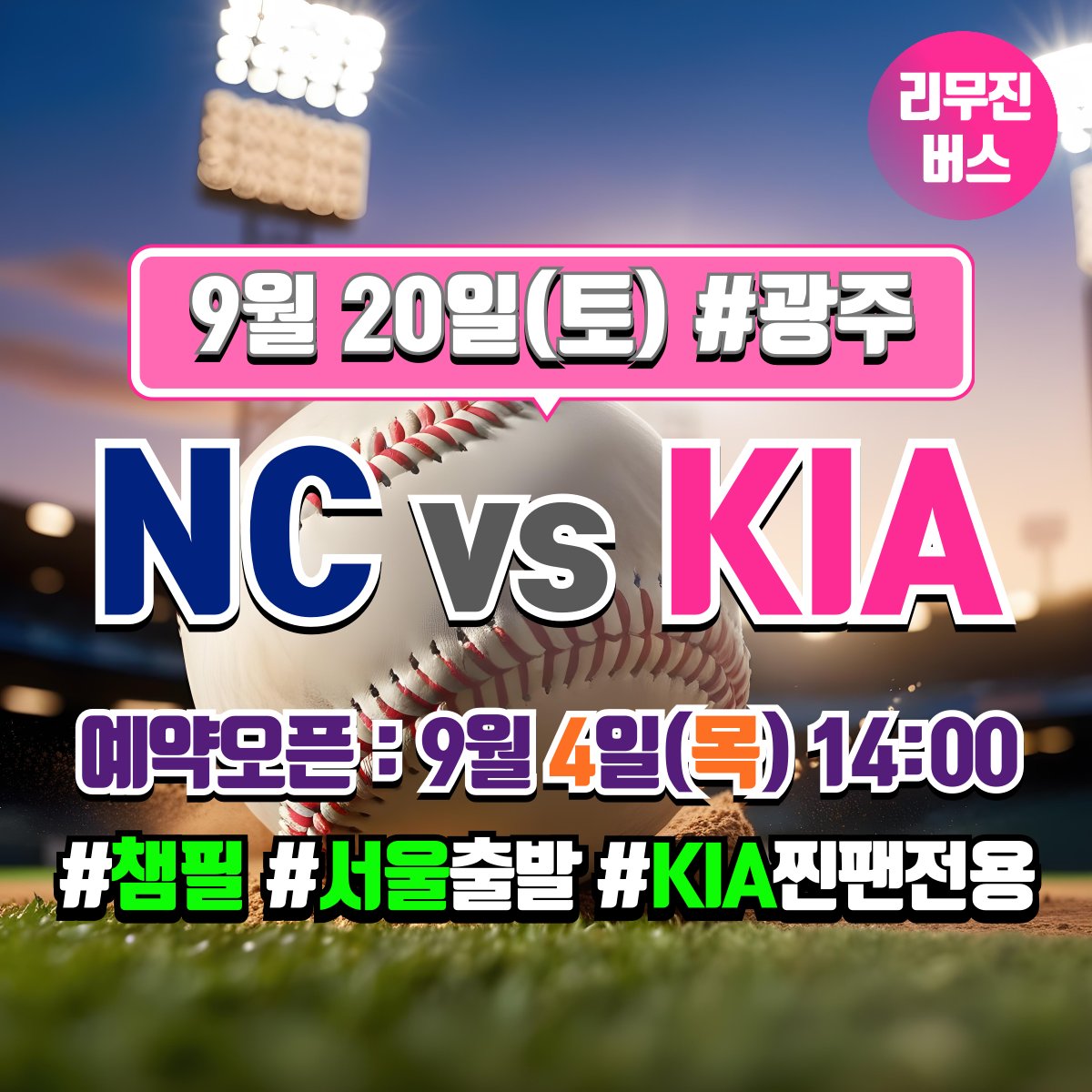 찐팬셔틀 @COS_RANKING · Sep 2, 2025 [KIA 타이거즈 찐팬 전용] 9/20 NC 전 [서울 ↔ 광주 챔피언스필드] 셔틀버스 예약 오픈일 안내 * 예약 오픈일 : 9월 4일(목) 14:00 * 좌석은 예약 선착순으로 지정석입니다. (좌석지정 불가) * 궁금한 점은 언제나 카톡으로 문의주세요. pf.kakao.com/_HPsvn #KIA타이거즈 #챔필 1 91