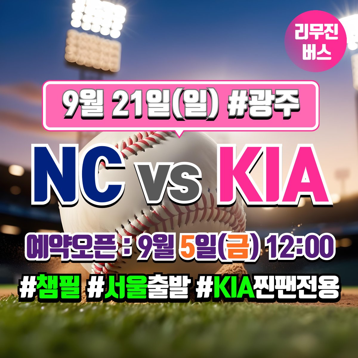 찐팬셔틀 @COS_RANKING · Sep 3, 2025 [KIA 타이거즈 찐팬 전용] 9/21 NC 전 [서울 ↔ 광주 챔피언스필드] 셔틀버스 예약 오픈일 안내 * 예약 오픈일 : 9월 5일(금) 12:00 * 좌석은 예약 선착순으로 지정석입니다. (좌석지정 불가) * 궁금한 점은 언제나 카톡으로 문의주세요. pf.kakao.com/_HPsvn #KIA타이거즈 #챔필 #챔피언스 1 133