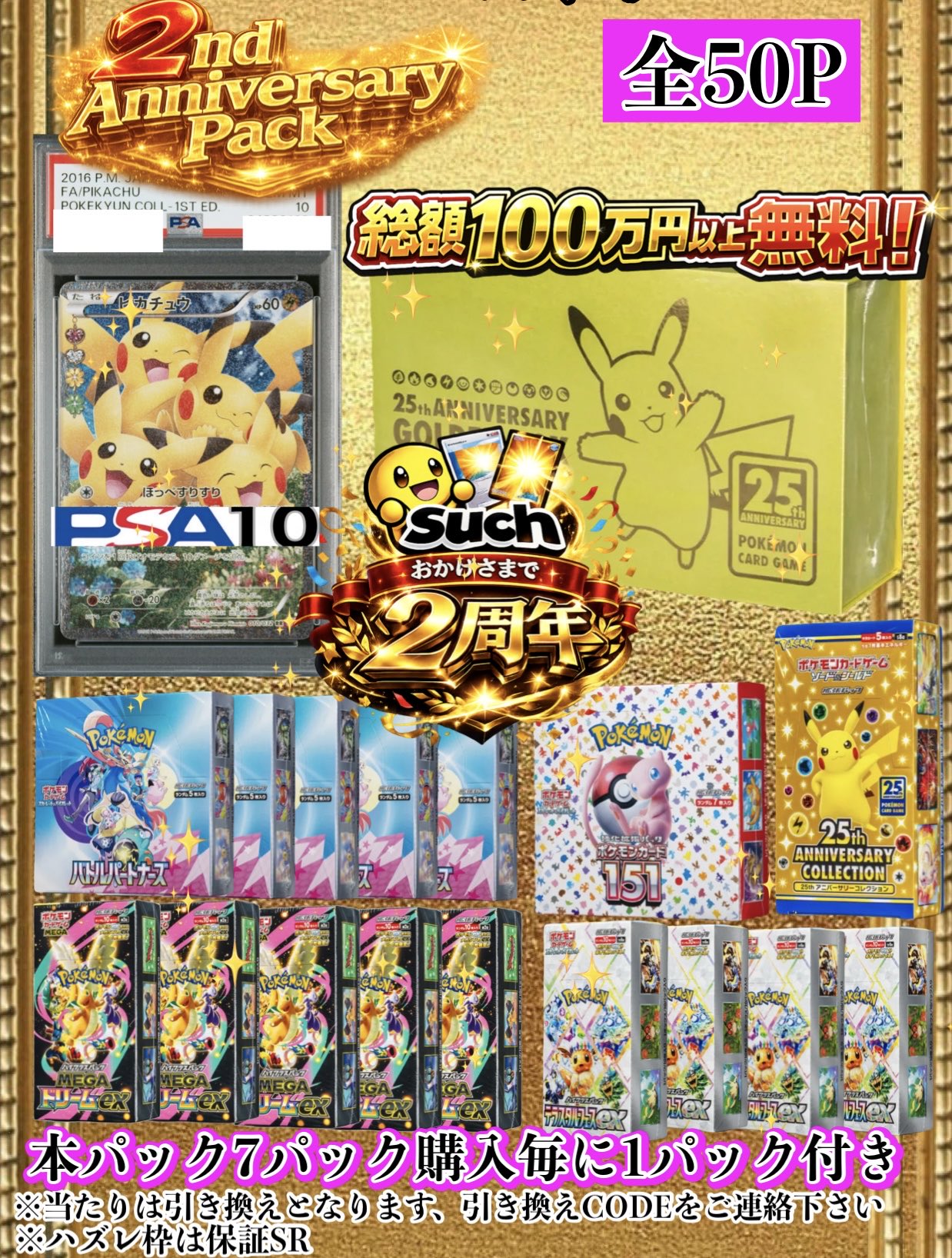 TCG SUCH(ポケカ オリパ) @tcgsuch · Mar 21 2ndanniversary pack 後購入は番号選択できないことから 7P購入で2Pおつけさせて頂きます! ✨残り7Pです❗️✨ 残りわずかです ※ゴールデンBOX、151は排出済み 4 8 1.2K