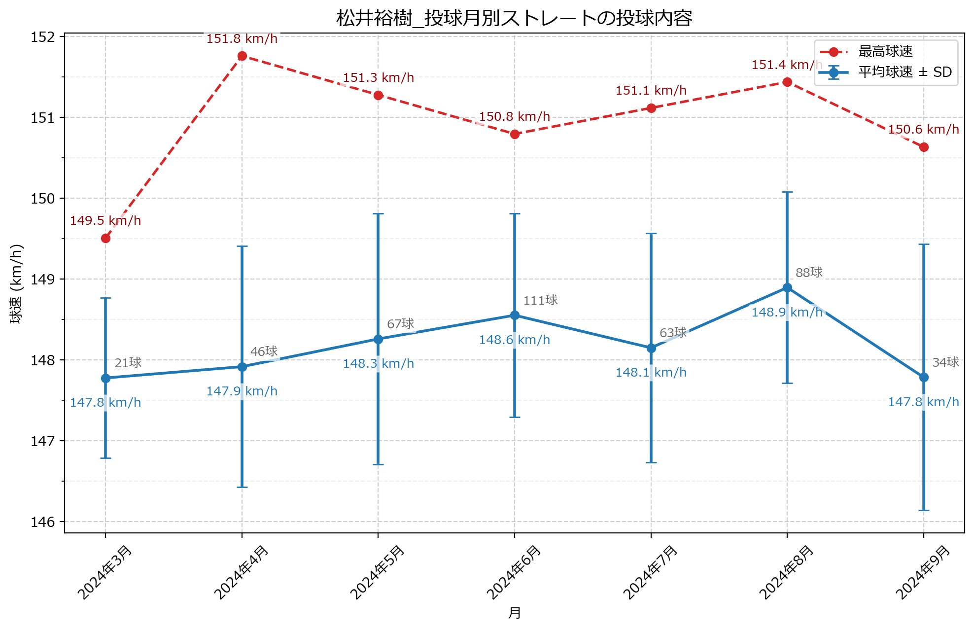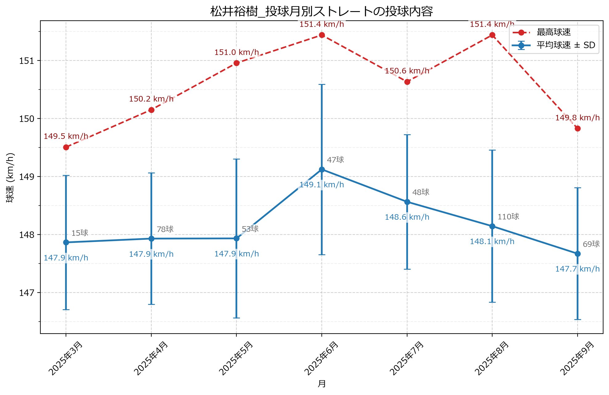 ゴニ御 @gonio_csv · Mar 21 2024 & 2025シーズン #松井裕樹 選手 月別ストレートの最高球速と平均球速の推移 ①2024年(64登板、最速151.8km/h) ②2025年(61登板、最速151.4km/h) #パドレス、#savant 【MLB速報】放送地区【大谷速報】 @MLB_comment · Mar 21 パドレス 松井裕樹 開幕IL入り クレイグ・スタメン監督 「松井裕樹(鼠径部痛)は開幕をILで迎えますが、近日中に打者相手に投球する予定で、復帰はそれほど遠くないと思います」 1 97