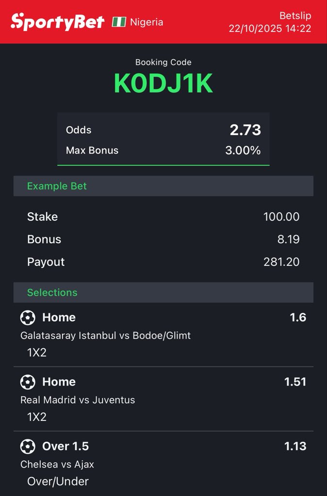 LsBillion💵 @AdeynkaFunds · Oct 26, 2025 Bet Responsibly, stake what you can afford to lose ⚠️ #2odd #bet #Sportybet Follow for follow, like and retweet. 85