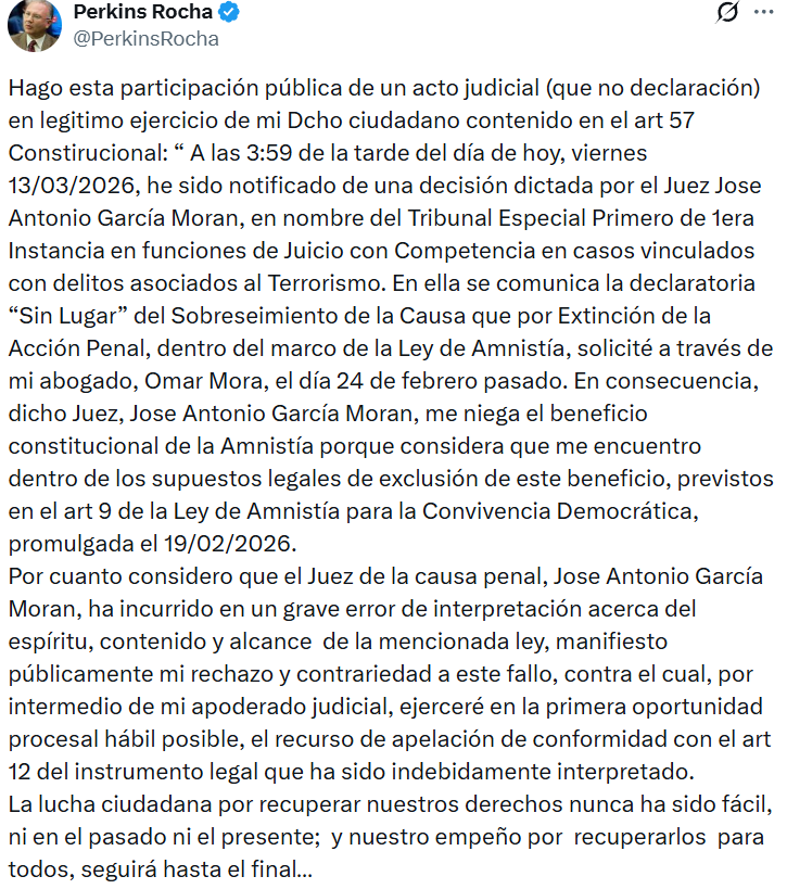 #13Mar | El abogado @perkinsrocha informó que le fue negado el beneficio de la amnistía para el caso en su contra, ya que, de acuerdo con la decisión del juez, se encuentra entre los delitos excluidos por la Ley de Amnistía. Rocha fue excarcelado el #8Feb y está en arresto domiciliario con una tobillera electrónica.