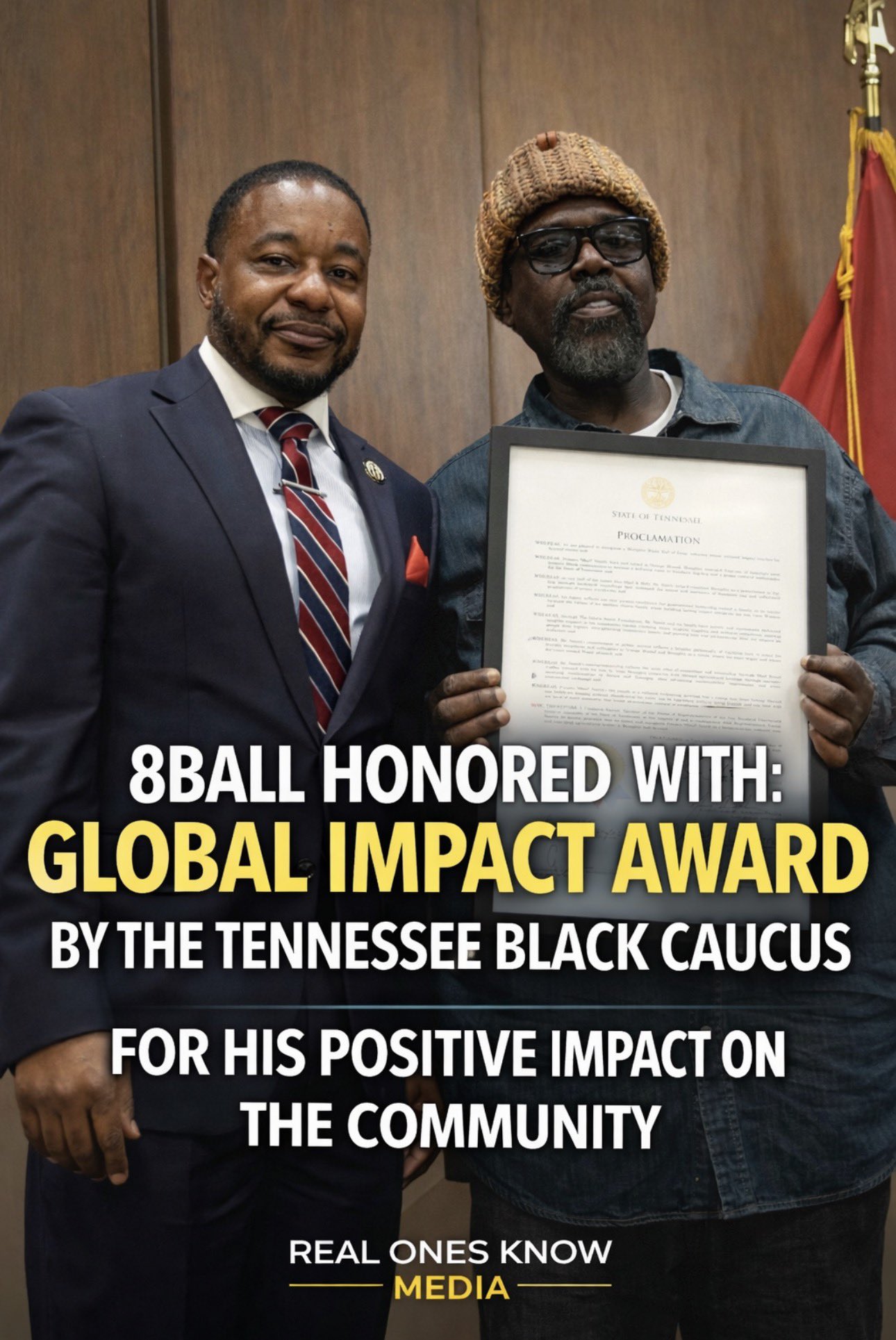 Congratulations! 8Ball (of 8Ball & MJG) was recognized with the Global Impact Award from the Tennessee Black Caucus for his work through The Gloria Smith Foundation. 8Ball was honored for his positive impact on the community.