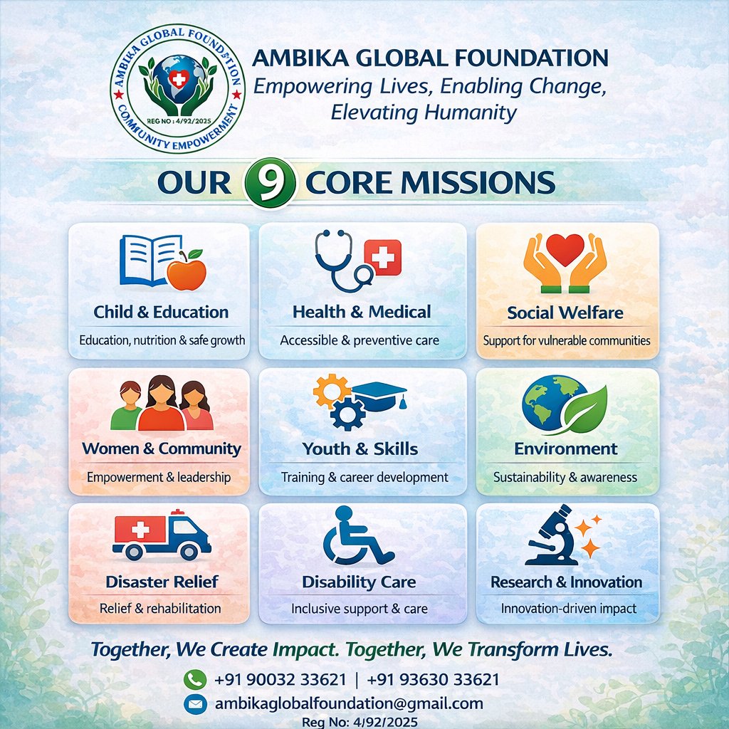 AMBIKA GLOBAL FOUNDATION @Ambika2412 · 5d 9 Missions. 1 Vision. 🌍 Transforming lives through healthcare, education, and empowerment. Join Ambika Global Foundation in building a better future. #AGF #impactdriven #NGO #healthcareaccess #socialchange #togetherwecan #communitycare #healthforall #ambikaglobalfoundationH 12