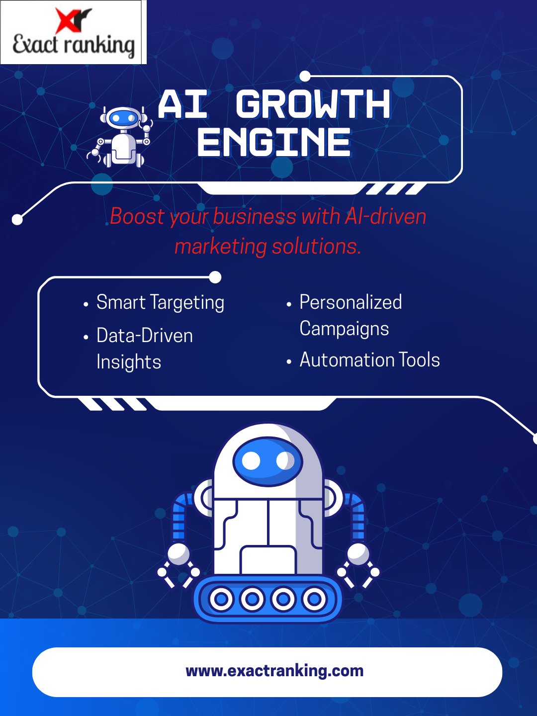 Exact Ranking @ExactRanking · Feb 25 An #AI #Growth #Engine is a smart, automated system that uses #Artificial #Intelligence (AI) to drive business growth by improving marketing, #AIGrowthEngine #AIAutomation #ArtificialIntelligence #MachineLearning #DigitalTransformation #SmartTargeting #exactranking 1 8