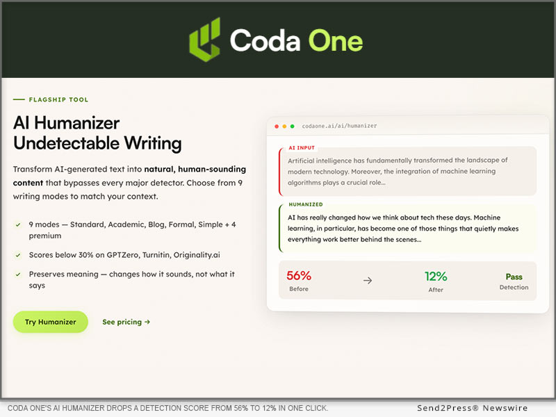 LONDON, UK, March 25, 2026 (SEND2PRESS NEWSWIRE) -- Coda One has built two tools that probably shouldn't exist in the same company. One rewrites AI-generated text so it reads like a person wrote it....