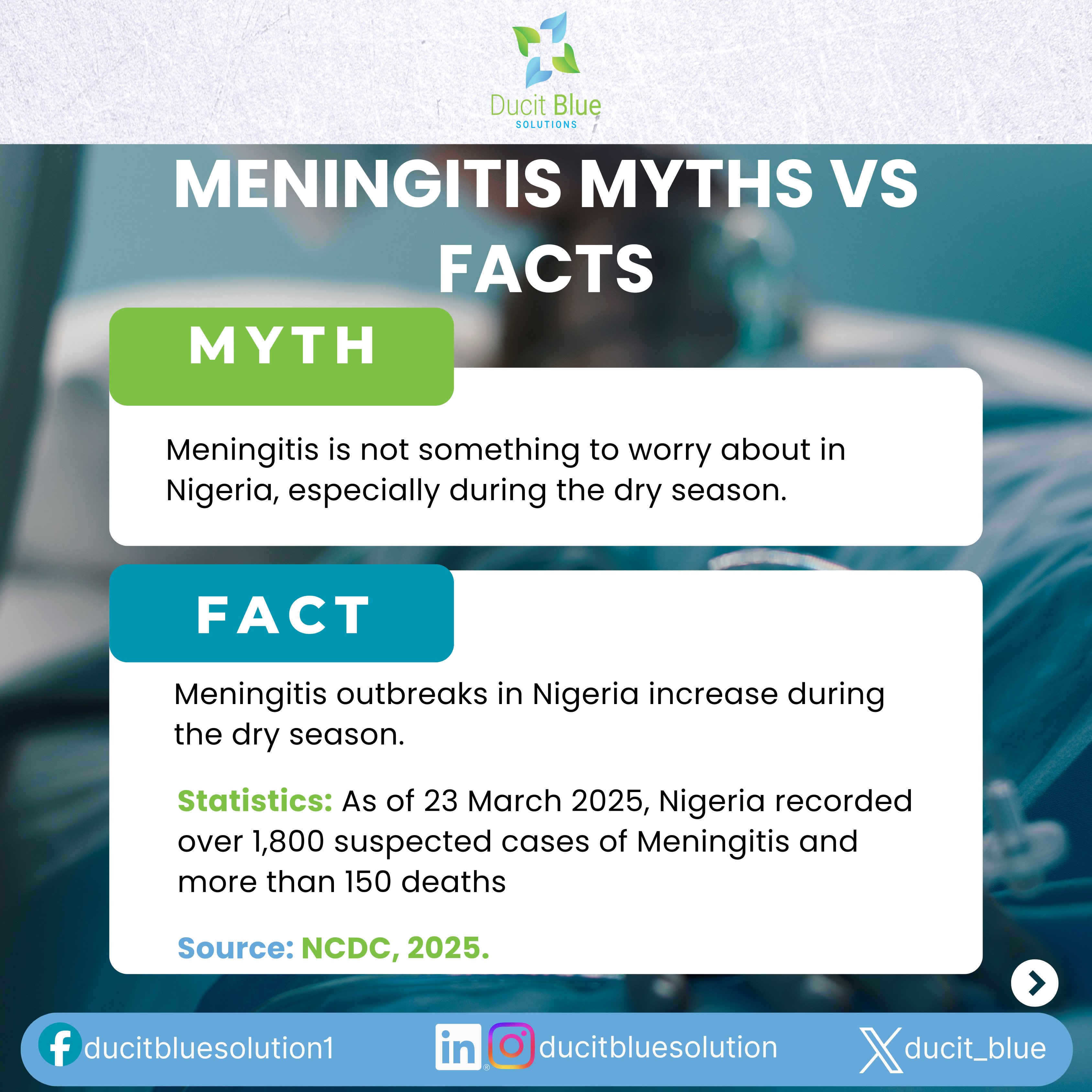 In Nigeria, meningitis remains deadly when early symptoms are missed. From late 2024 to March 2025, over 1,800 suspected cases and 150+ deaths were reported (@NCDCgov).