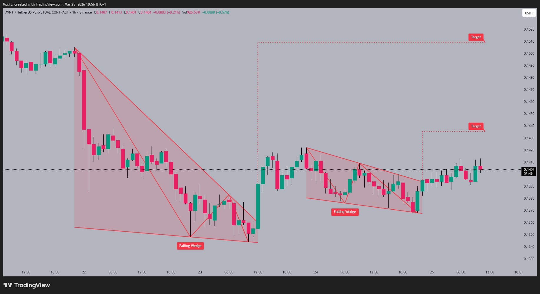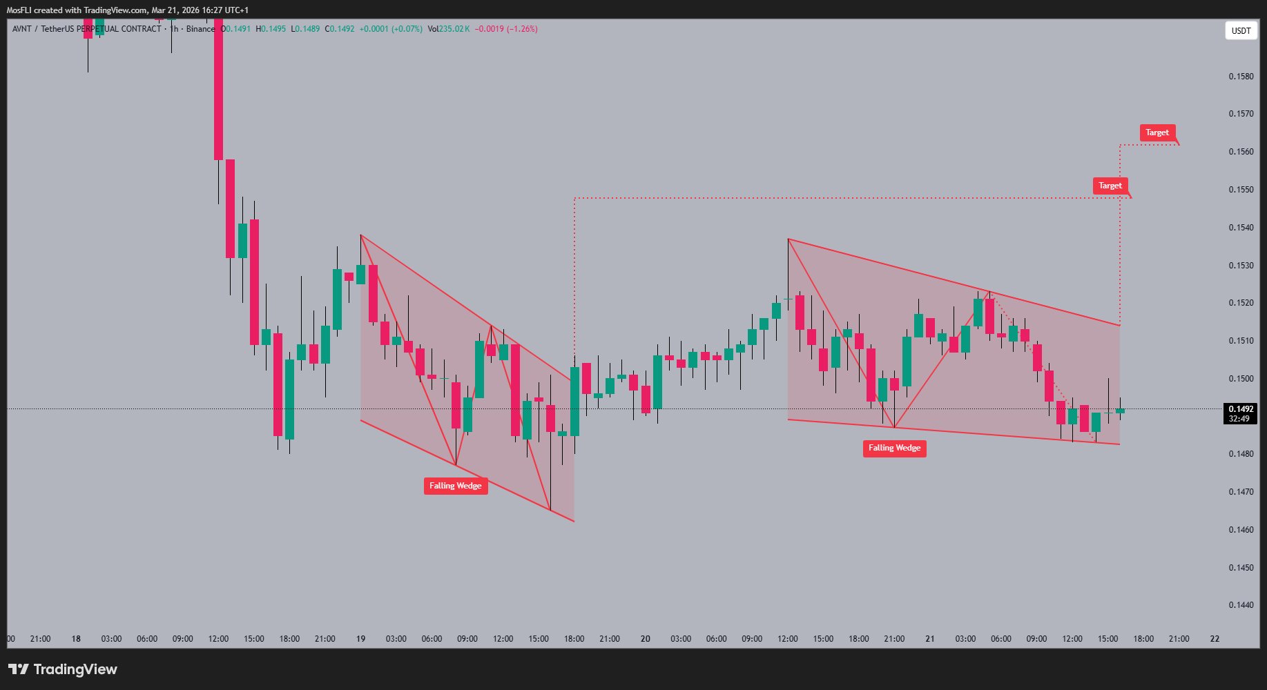 #AVNT is currently trading at 0.1492 📉, showing some consolidation after recent volatility. The chart shows a potential falling wedge pattern 📐 which often signals a bullish reversal. Keep an eye on the 0.1550 target for a possible breakout �Hyq