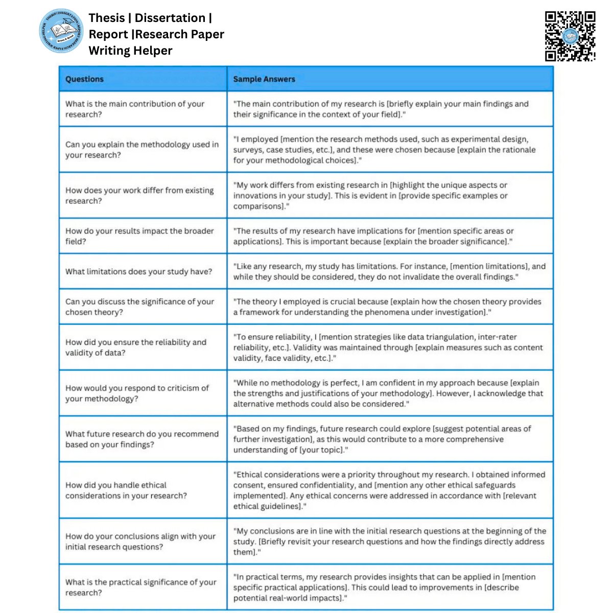 Thesis and dissertation defenses often include questions about methodology, contributions, and research impact. This visual outlines common PhD defense questions with structured sample answers to help researchers prepare effectively.
