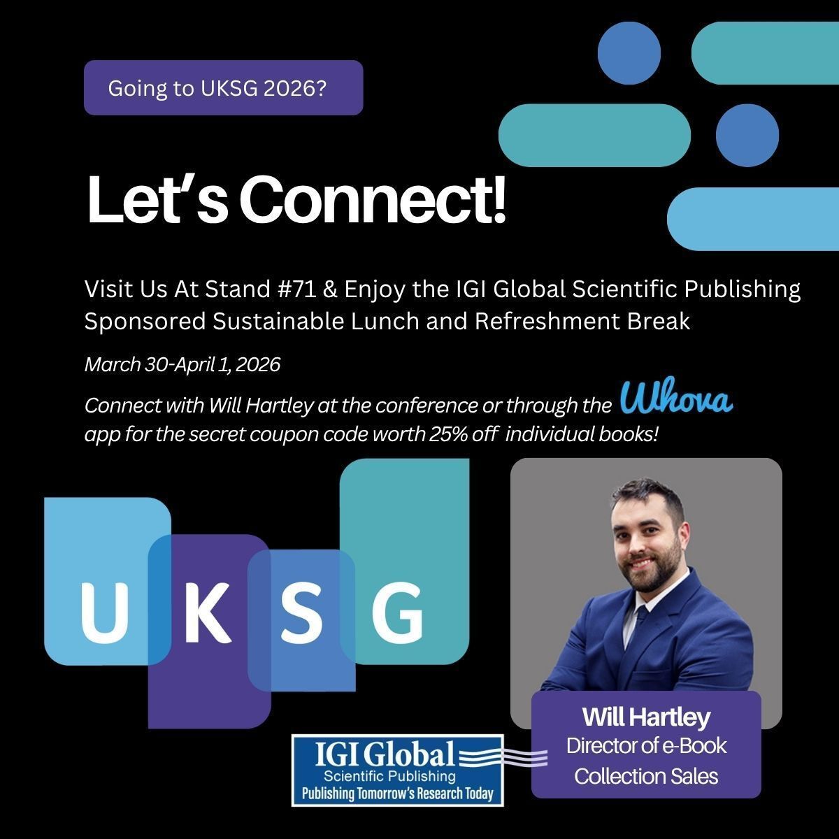 Visit us at stand 71 at #UKSG2026 & enjoy the IGI Global Scientific Publishing sponsored sustainable lunch and refreshment break! Connect with William Hartley to get the secret coupon code for 25% off individual books.