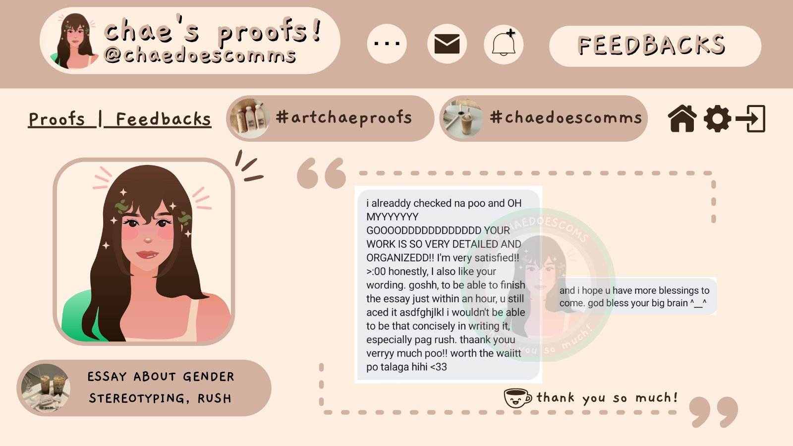 Chae ☘️ OPEN FOR COMMISSIONS! @chaedoescomms · Jul 18, 2021 Replying to @chaedoescomms ☕ feedback 115¦#chaedoescomms 💌 she's so sweet, and most of all, kind. thank you so much for being one! 🌱 thank you so much! #academiccommissipi