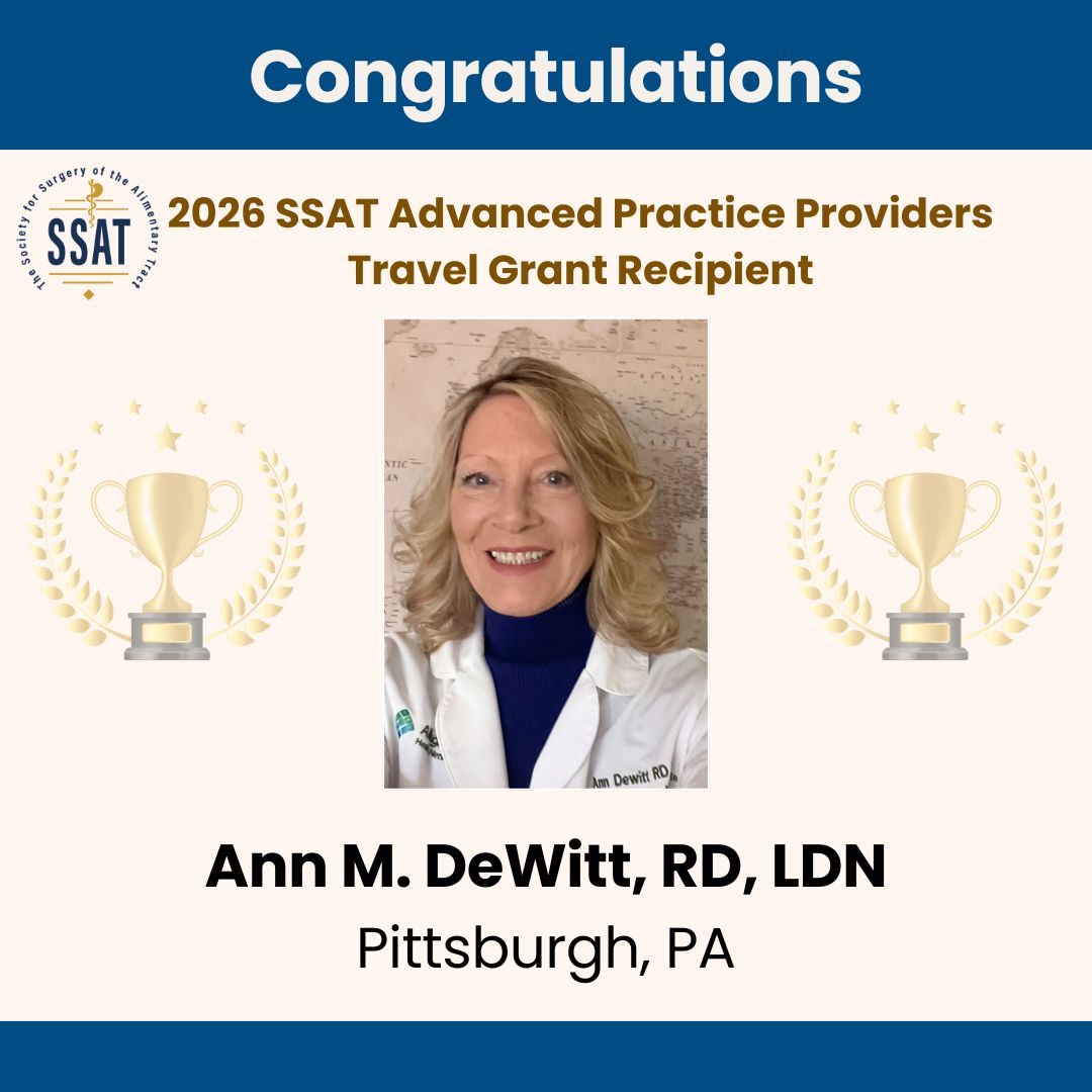 Congratulations to Ann M. DeWitt, RD, LDN, recipient of the 2026 SSAT Advanced Practice Providers Travel Grant! 👏