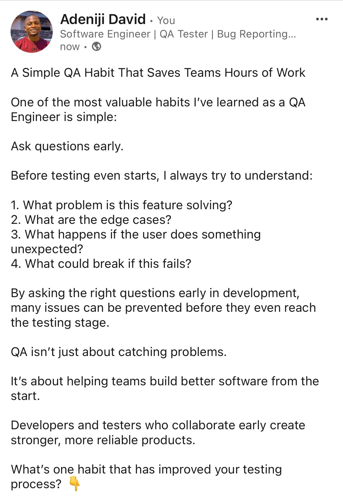 From headspin.ioPractical steps to make testing a shared responsibility: collaborate on acceptance criteria, in-sprint testing, automation, and continuous feedback.