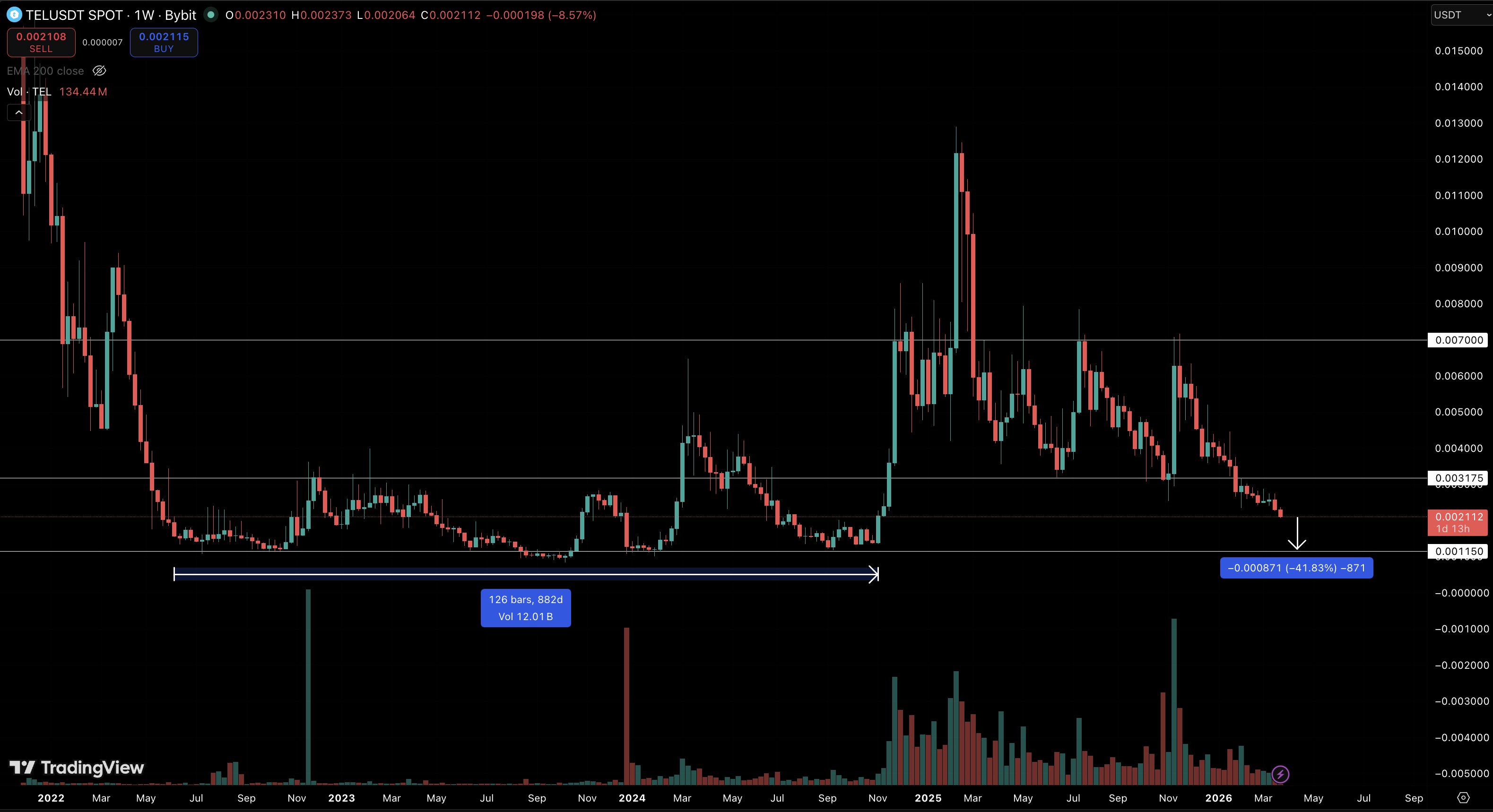 #Telcoin likely grinds down toward $0.0011 (another ~40% from here), then trades sideways for another 12–18 months of dead money