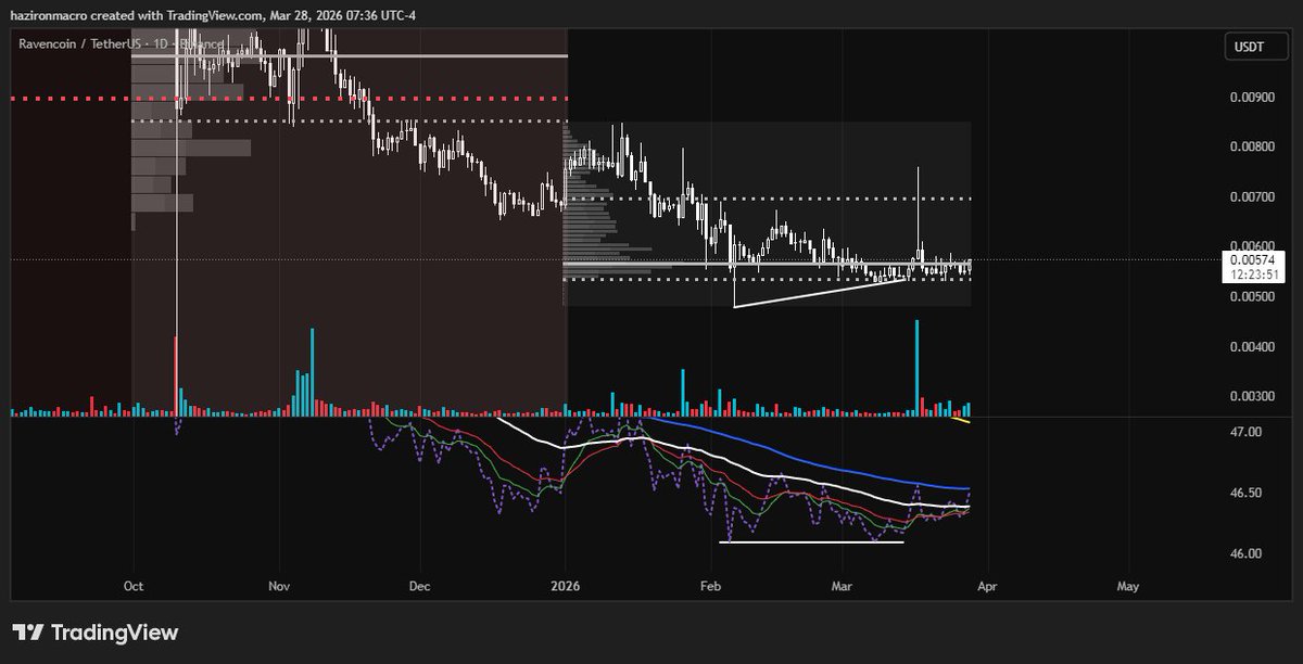 Price is attempting to reclaim the developing quarterly POC. Clear bullish divergence on the 200 period RSI, backed by a sharp spike in buying volume on March 17th. f we get clean acceptance above the POC, the next upside target is the VAH.