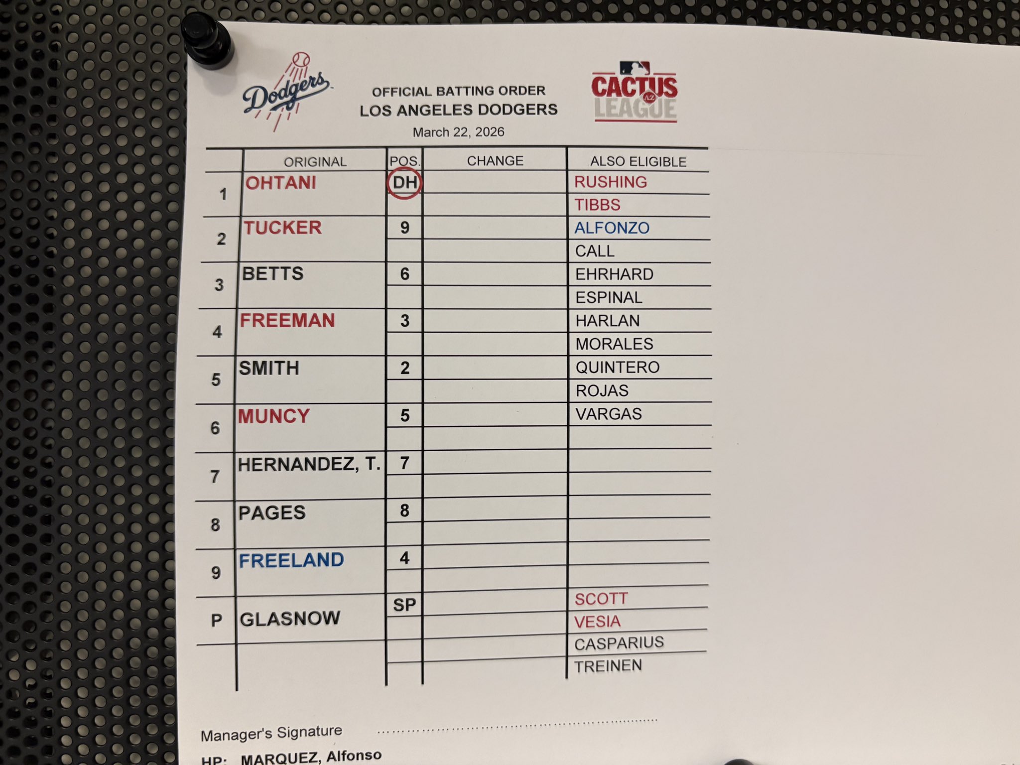 Dodgers lineup against the Angels Sunday in Anaheim. Alex Freeland at second base after being informed he made the team earlier today @billplunkettocr #Dodgers #AlwaysLA #DodgersST