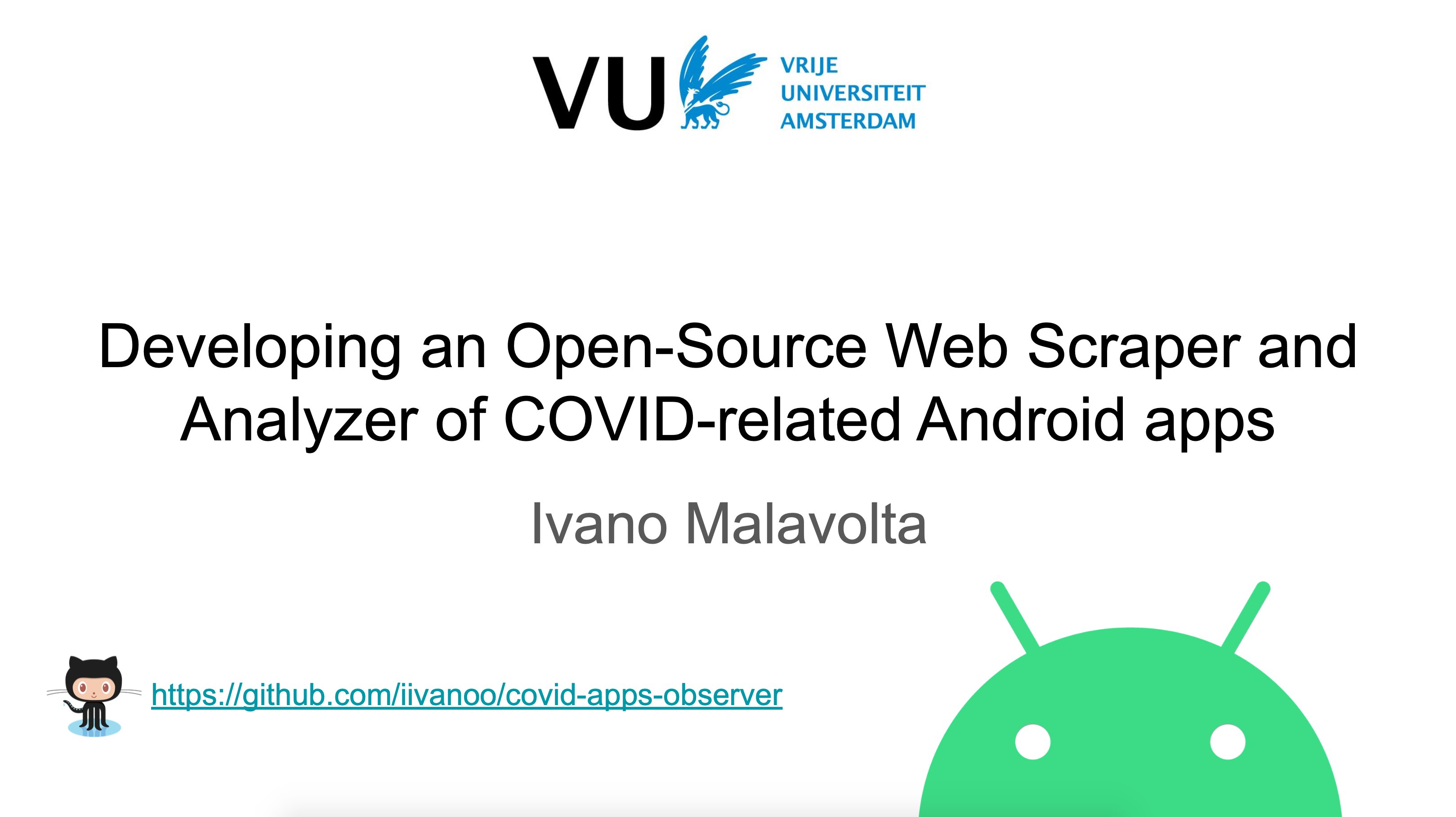 Ivano Malavolta @IMalavolta · Jun 19, 2020 Yesterday I talked about my COVID apps observer at the #ResearchCocktails of the @VUamsterdam, very good vibes! 🖼️ Slides:docs.google.com/presentation/u…l 💻 GitHub repogithub.com/iivanoo/covid-…mJ@AndroidAut@h @AndroidDe@v @AndroidSecurit@y @androidcentra@l @Android #Android #AndroidSesg 9