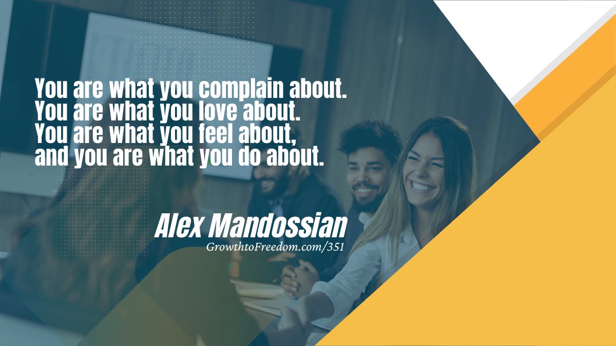 You are what you complain about. You are what you love about. You are what you feel about, and you are what you do about. - Alex Mandossian #351 #business #powerofpaid #appointmentbased #high-ticket #beginningofmastery #greatestvalue #growth #freedom traffic.libsyn.com/growthtofreedo…