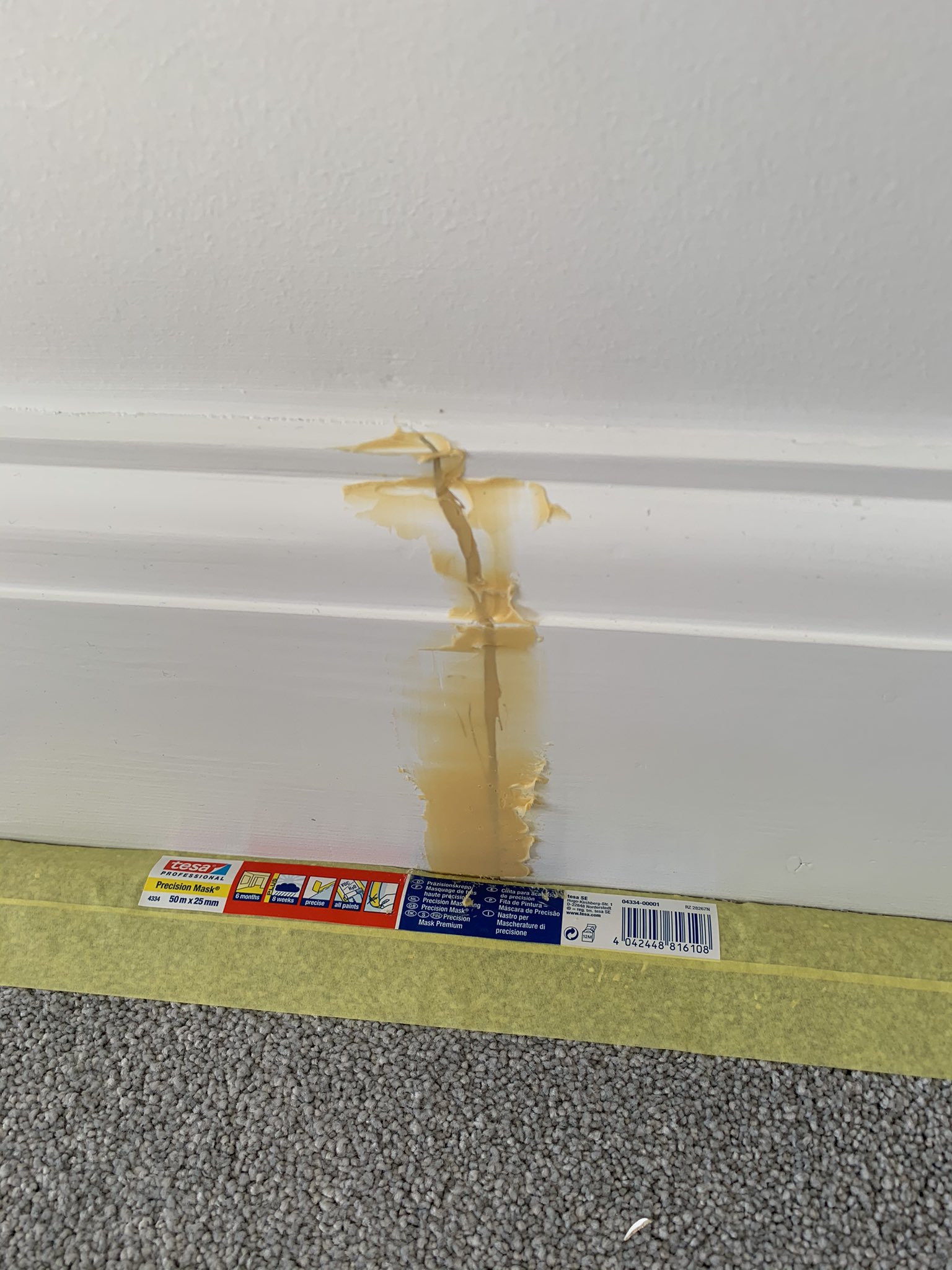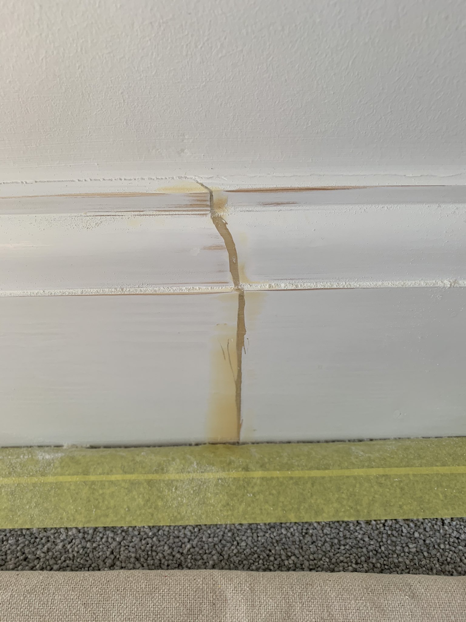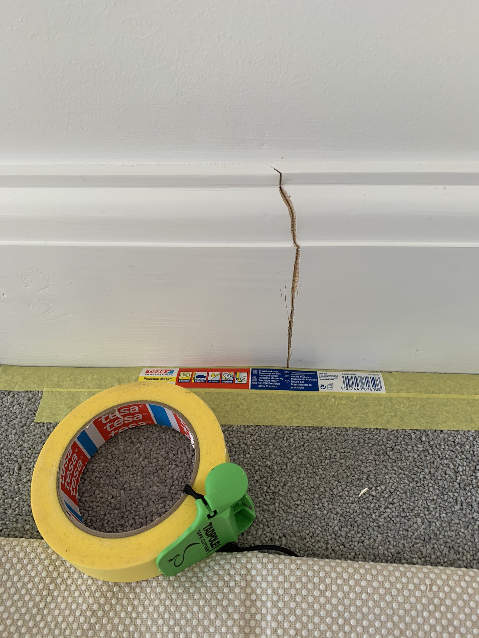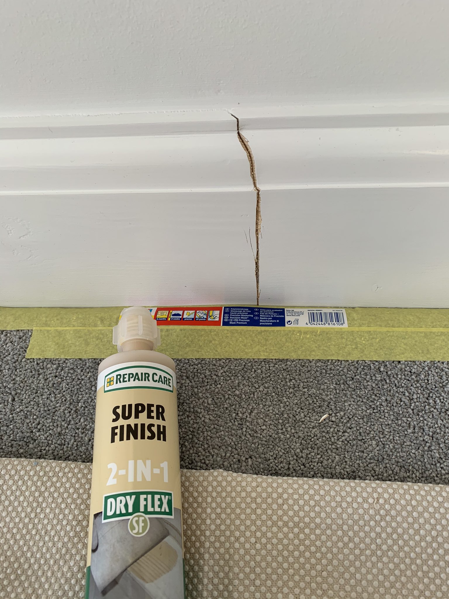 A great example of where the @repaircareuk Super Finish comes in handy for little filling repairs. This joint in the skirting flexes along a long lounge wall. Other fillers would be too static to cope with the movement. No problem with resin fillers. @tesaUK_tape#apprenticetips