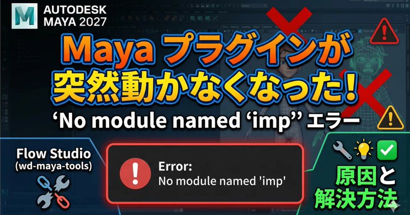 はじめに Autodesk Mayaのプラグイン wd-maya-tools(Flow Studio Character Validator)を使おうとしたら、こんなエラーが出て動かなくなった? Autodesk Maya 2027での出来事!! ModuleNotFoundError: No module named 'imp' このエラー、原因はシンプルです。この記事では なぜ起きるのか と...
